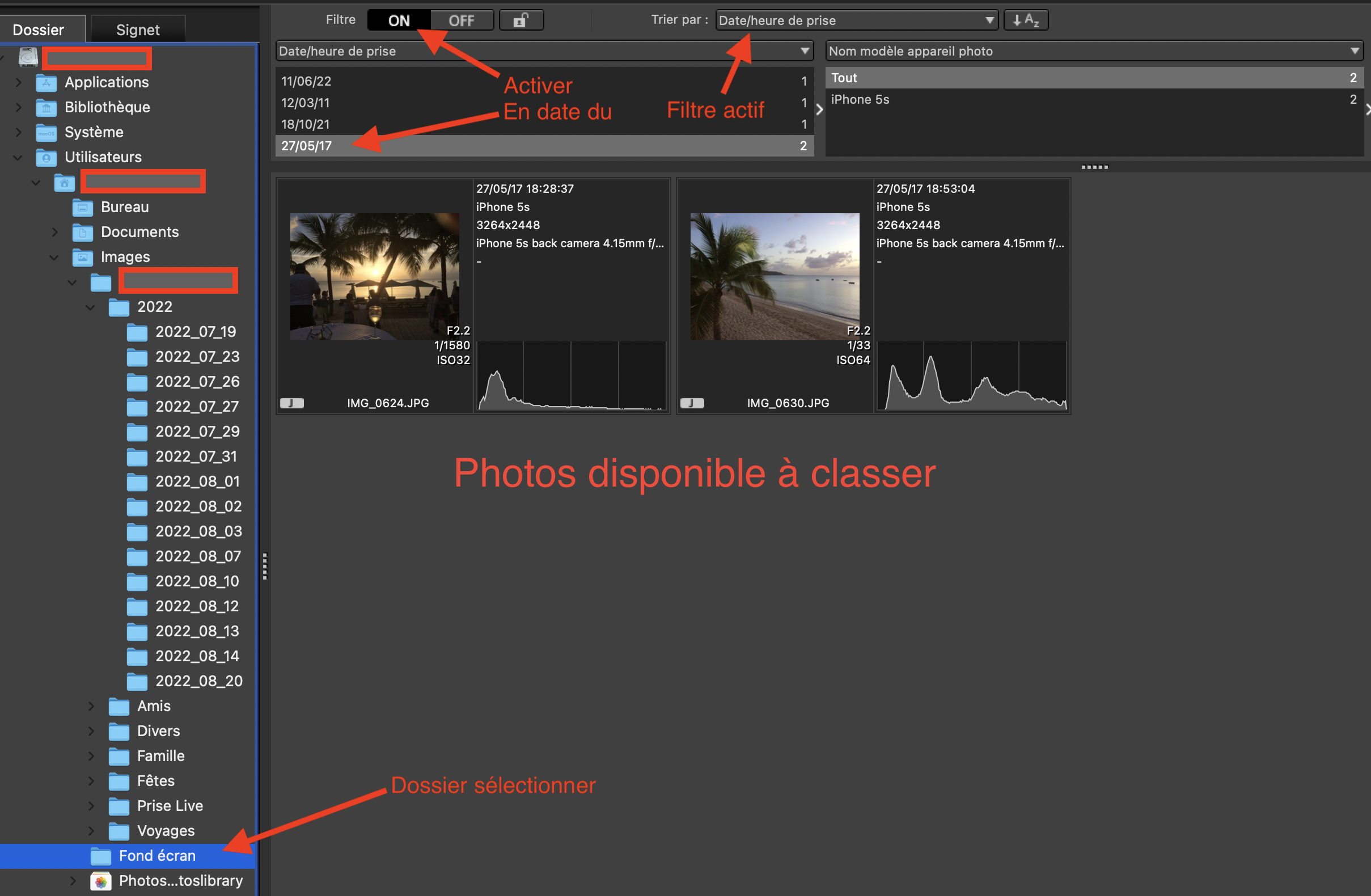 Soit j'exporte basique, puis j'importe dans lightroom (j'ai la version 6 mais je ne suis pas encore passée sur macOS Monterey), puis j'exporte de lightroom vers finder en ajoutant la date. Mais dans ce cas je n'ai pas réussi à trouver le format de date "année-mois-jour", je n'ai que "jour-mois-année", et donc je ne peux pas les trier par date. J'y regarde encore car c'est la méthode la plus rapide.