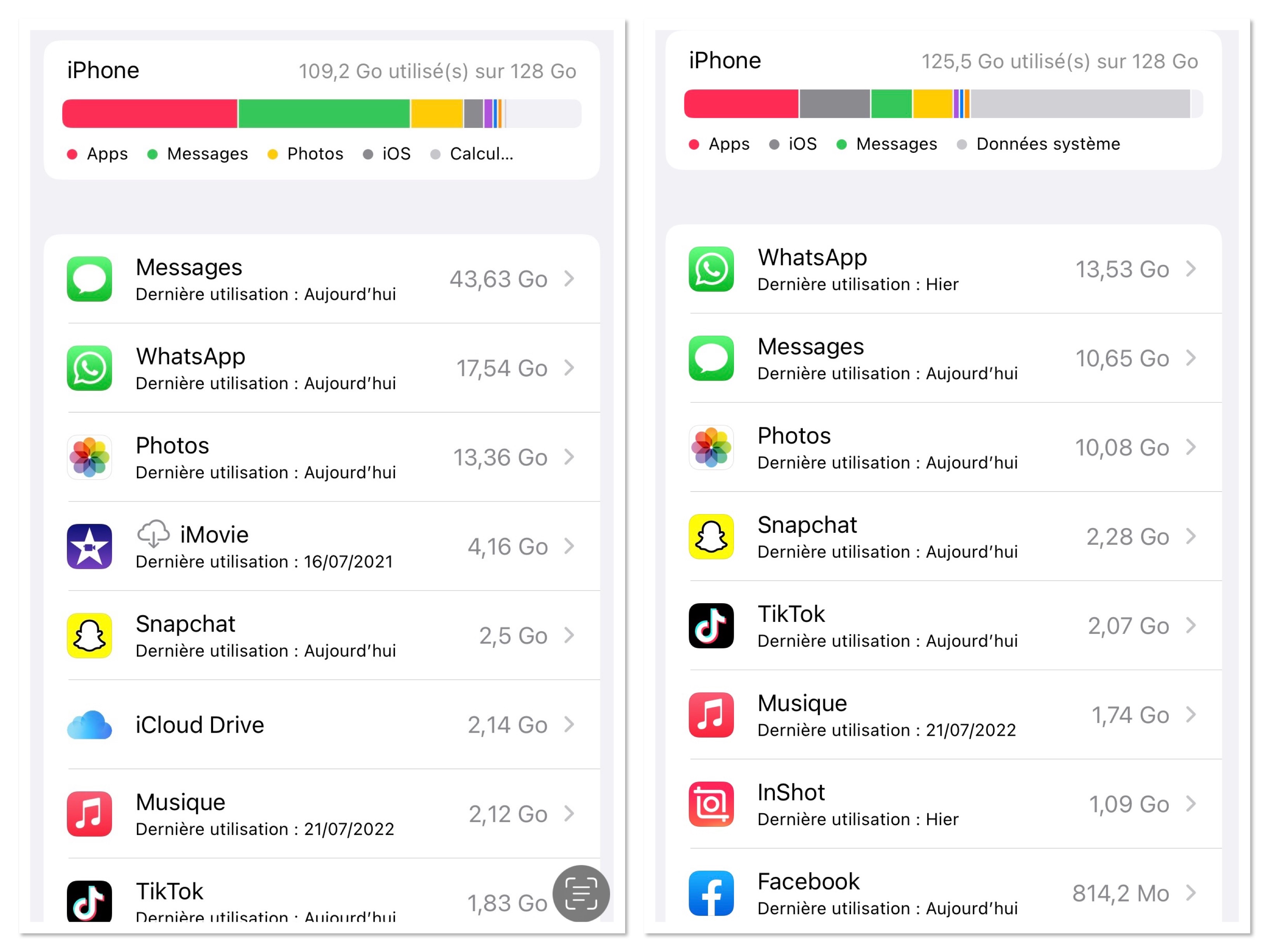 Bonjour, j’ai un souci avec mon iPhone 12 Pro depuis 1 semaine. J’étais à 100go occupé sur 128, je décide de faire un petit tri dans mes applis les plus lourdes à savoir whatsapp, messages et photos + suppression des applis inutiles. J’ai supprimé l’équivalent de 40go. Et depuis mon stockage est saturé à 127go (avec message de stockage saturé), à cause des donneés systèmes qui explosent, je ne comprends pas et ne trouve pas le moyen de baisser ça. J’ai éteint l’iPhone, vidé le cache safari, j’ai même déchargé les + grosses applis pour voir mais rien ne change, ça continue d’augmenter. Mon iOS est à jour. Et j’utilise iCloud pour le stockage de tout mon tel.