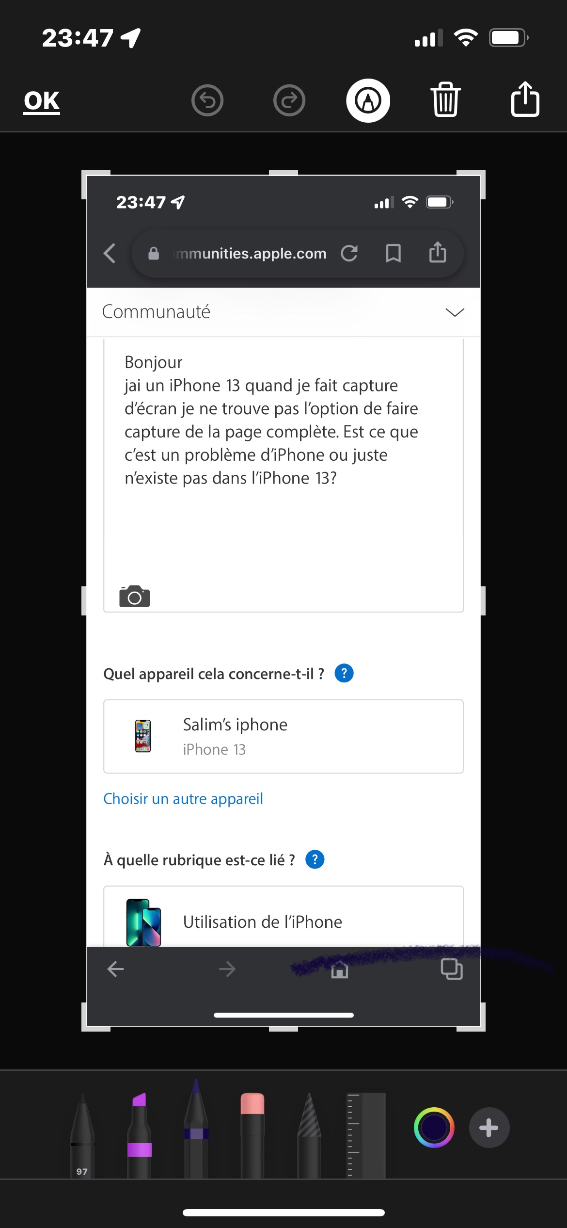jai un iPhone 13 quand je fait capture d’écran je ne trouve pas l’option de faire capture de la page complète. Est ce que c’est un problème d’iPhone ou juste n’existe pas dans l’iPhone 13?