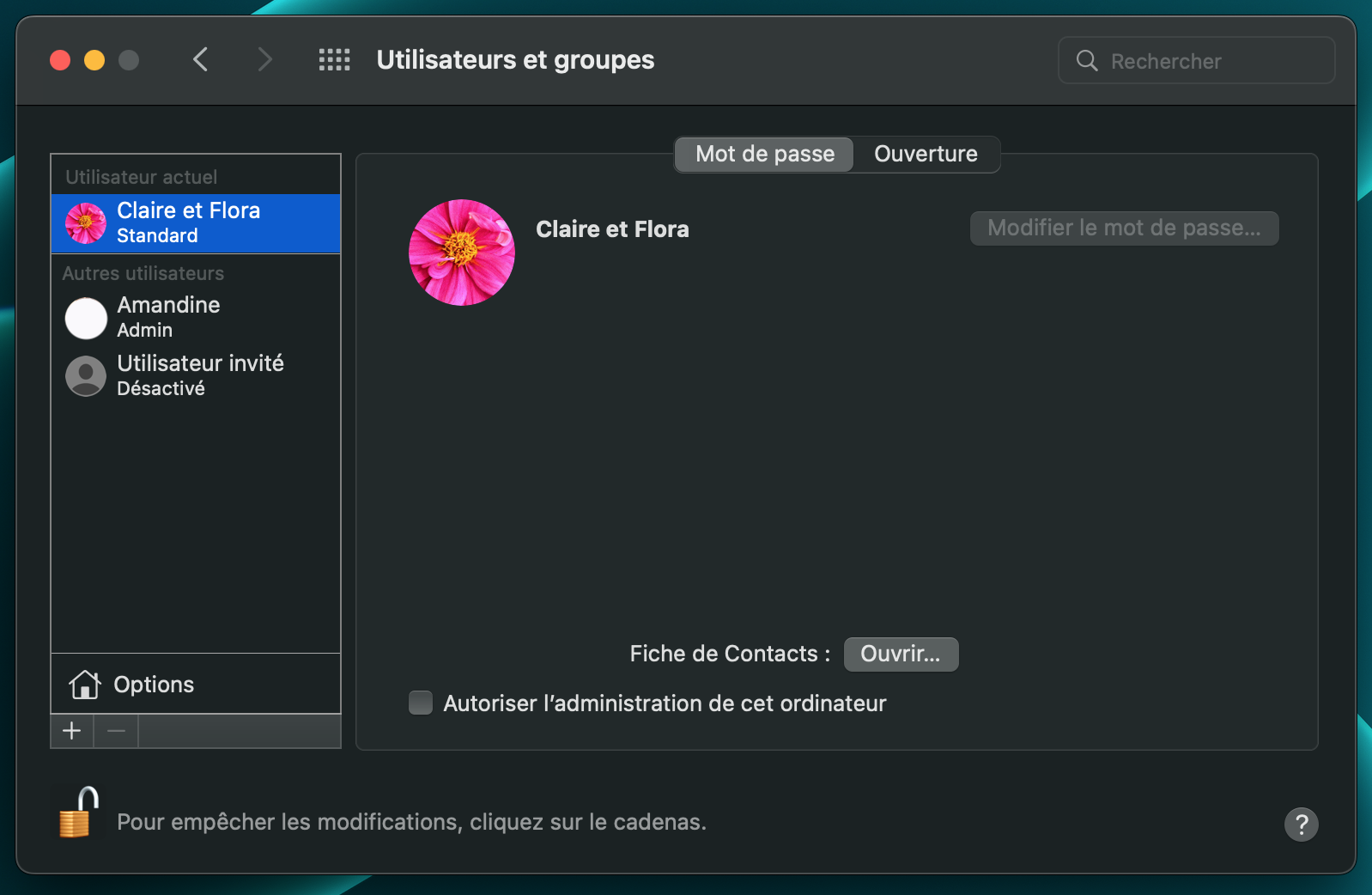 Lorsque j'ai créé le profil utilisateur pour mes filles, je n'ai pas jugé pertinent de mettre un mot de passe. Je n'ai donc rien mis dans les champs. Grave erreur ... maintenant je suis bloquée, tout apparaît en gris, je ne peux plus rien modifier ( elles veulent un mot de passe), je ne peux même pas supprimer leur profil utilisateur pour en créer un autre (le signe - ne s'affiche pas). Dans certains cas on me demande le mot de passe mais il n'y en a pas ... bref c'est l'histoire du chien qui se mord la queue. Aucune aide apple n'est utilisable car à chaque fois "modifier le mot de passe" "-" ... sont en gris donc inaccessibles.