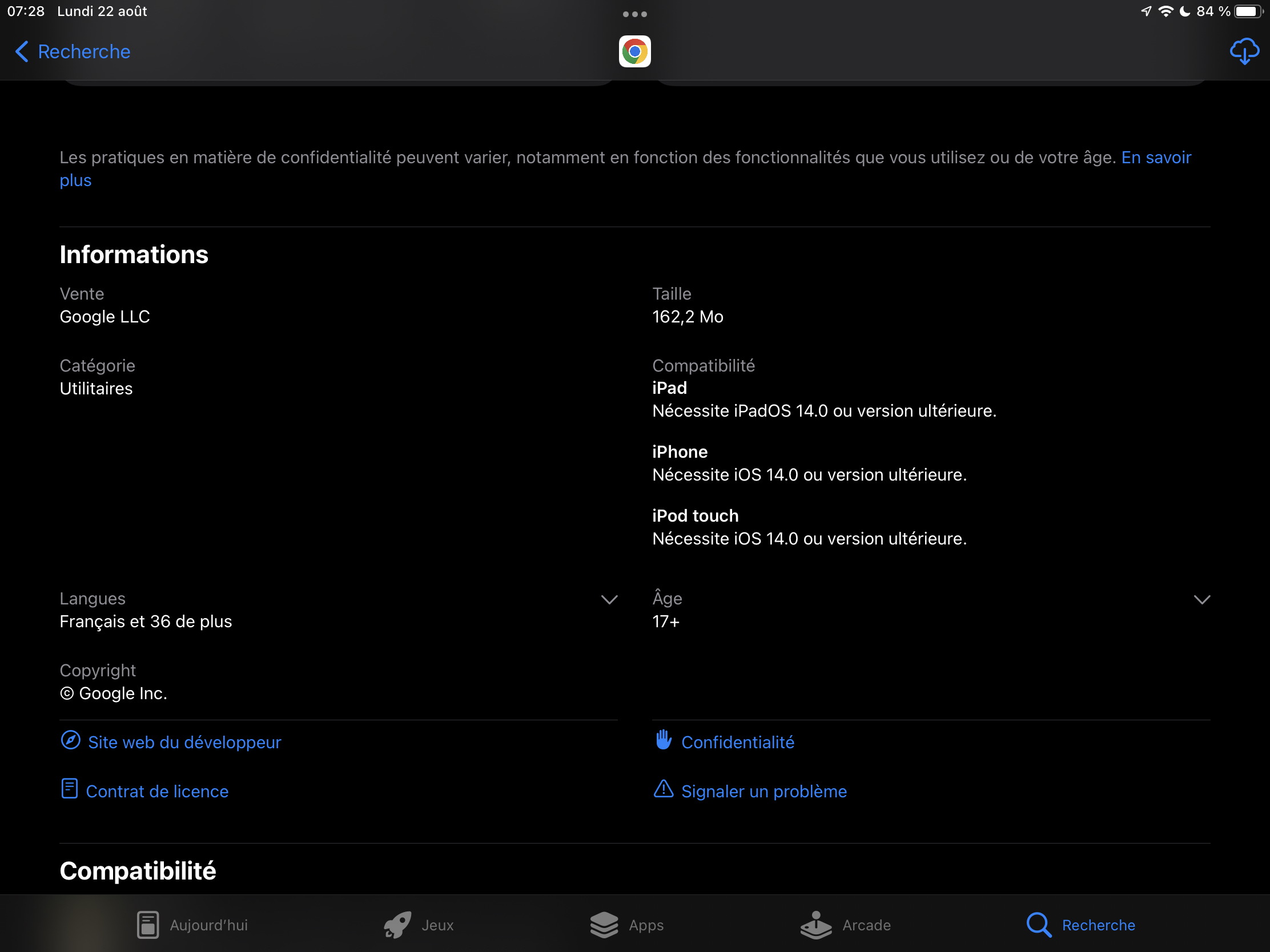 Mais Chrome ne peut pas être installé sur un iPhone 6 sous iOS 12 avec la version disponible sur l’AppStore; celle-ci demande iOS 14 à minima.