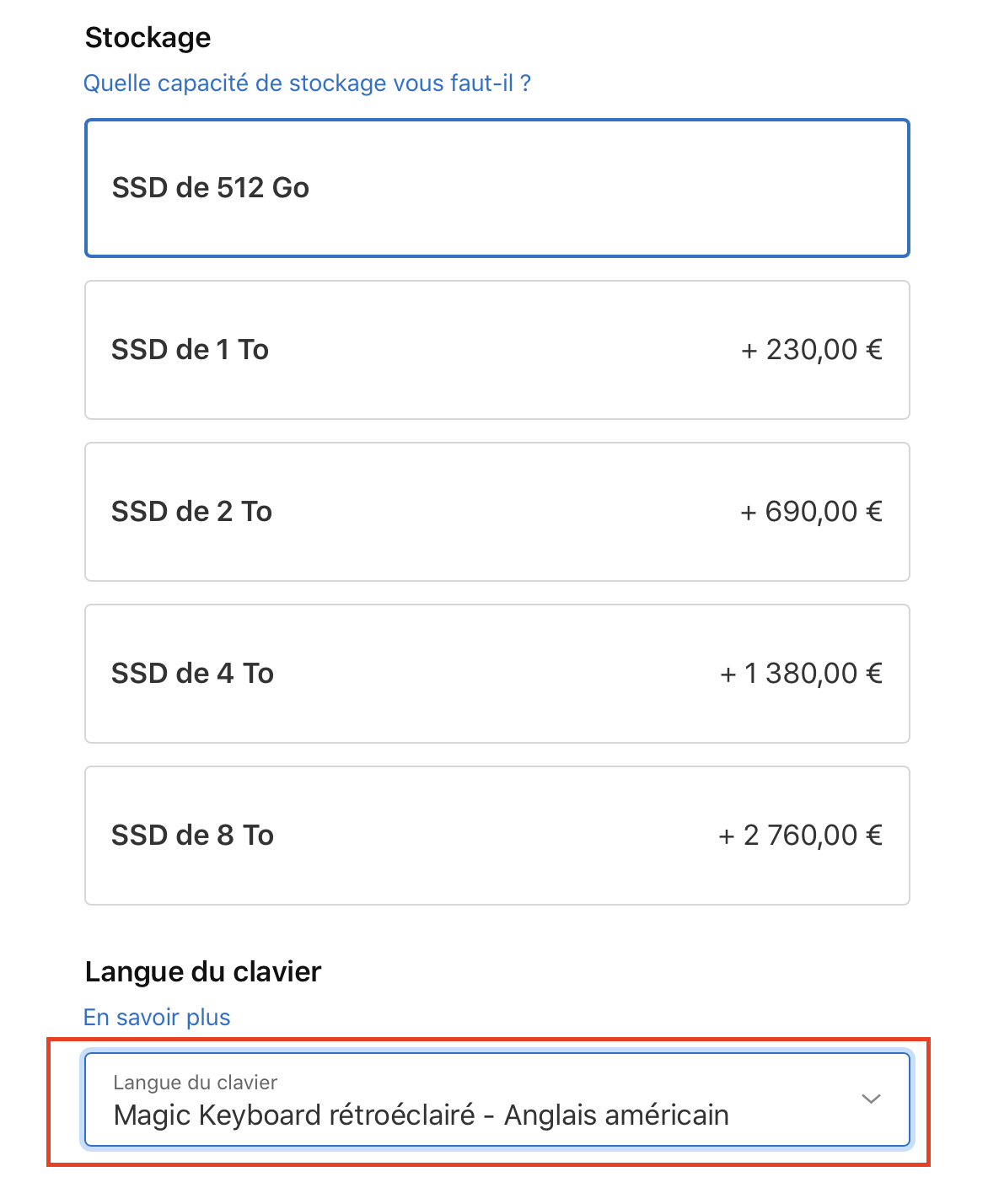 Quand vous passez la commande sur Apple.fr, vous pourrez choisir le clavier QWERTY (Anglais américain) :
