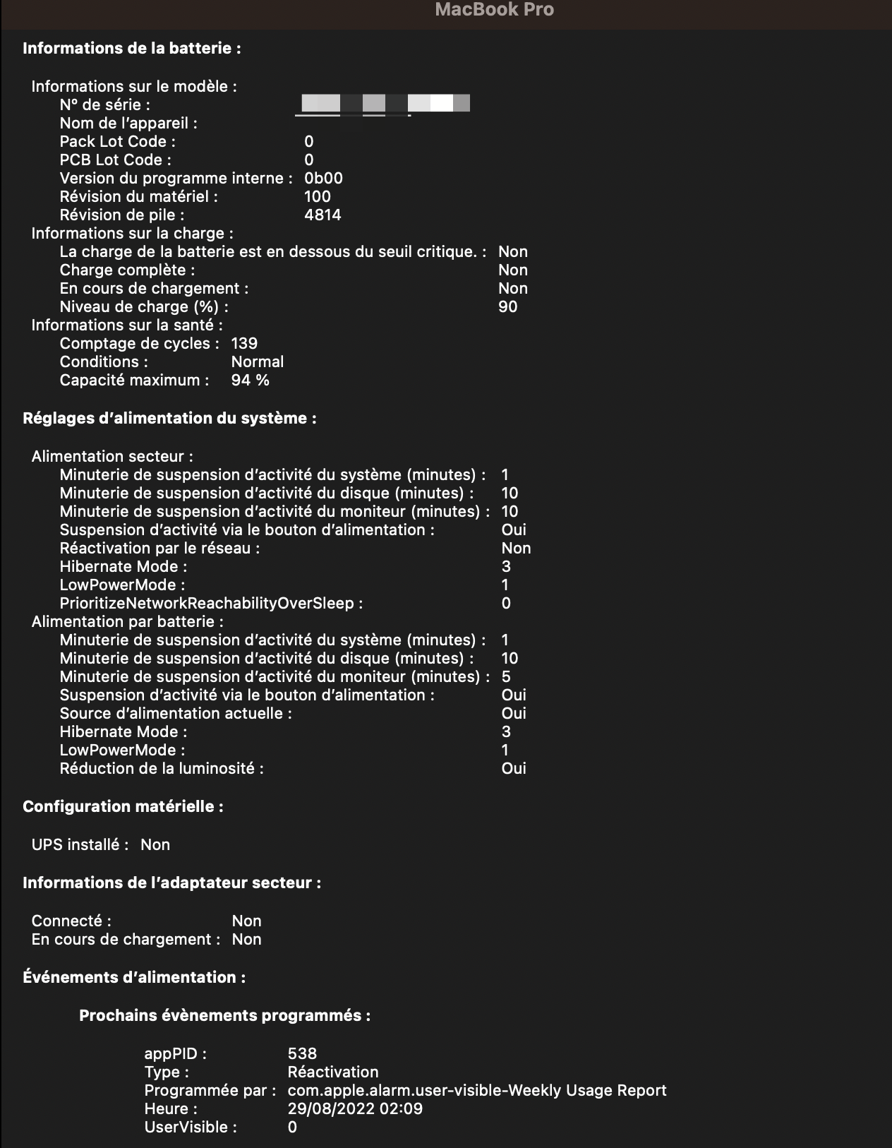 Depuis quelques semaines, la santé de la batterie de mon MacBook Pro 14 M1 acheté en novembre dernier se dégrade plus rapidement alors que je n'ai rien changé à mon utilisation. J'ai une utilisation plutôt light qui me fait tenir deux jours avant de le recharger: Le Bluetooth n'est pas activé, l'écran est allumé au même niveau (4 crans) et pas de rétroéclairage du clavier. Je suis passé d'une perte de 1% chaque 45 cycles de charge jusqu'au 135e cycle et depuis j'ai perdu 5% en 5 cycles de charge (je suis au 140e). À ce rythme je vais atteindre les 80% en peu de temps. Le Mac ne me signale aucune application gourmande en background.