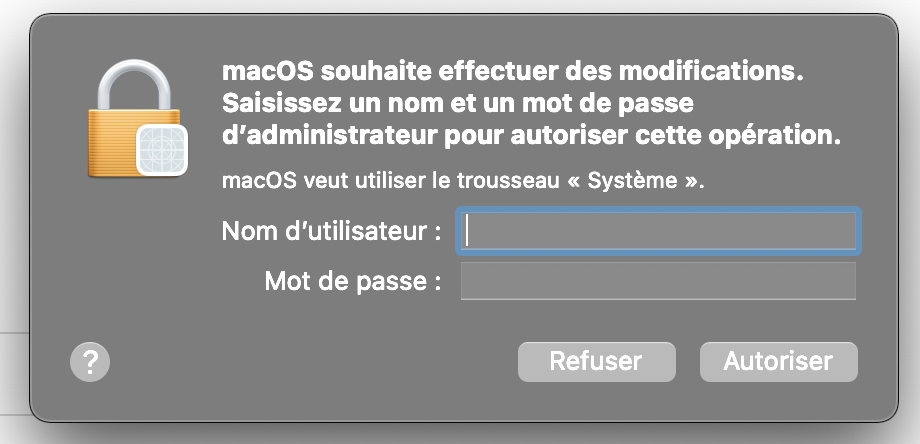 j'ai une fenêtre qui s'ouvre tout le temps sur mon Macbook pro avec le message : "macOS souhaite effectuer des modifications. Saisissez un nom et un mot de passe d'administrateur pour autoriser cette opération. MacOS veut utiliser le trousseau système". Elle apparait dès que j'allume mon Mac. J'ai essayé de refuser mais elle réapparait quelques secondes après, et j'ai essayé de mettre mon nom et mon mot de passe, ça enlève la fenêtre puis dans la minute la fenêtre revient...
