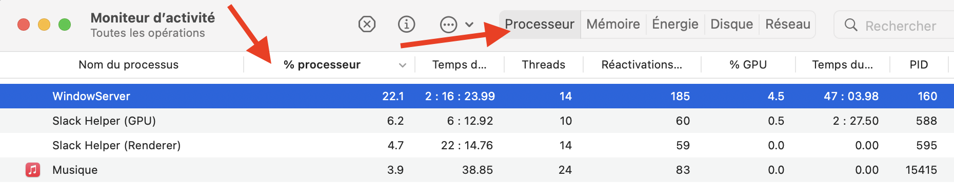 Clique sur l'onglet Processeur et classe par ordre décroissant le menu % processeur comme indiqué sur l'image. Que vois-tu ?