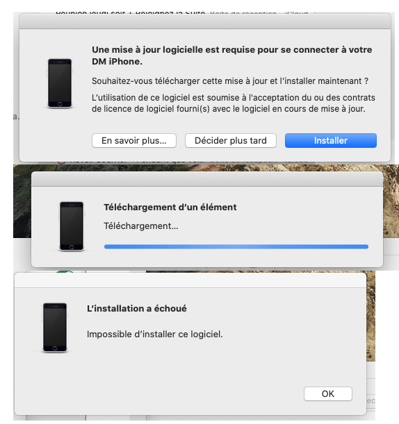 Quand je connecte via USB mon iPhone sous iOS 15.6.1 à mon iMac sous MacOS Catalina 10.15.7, la fenêtre jointe apparaît, me demandant de télécharger une mise à jour. En acceptant "installer", on aboutit à "L'installation a échoué, impossible d'installer ce logiciel". Il y a déjà deux posts sur ce problème sur le support, mais je ne les ai pas retrouvés…