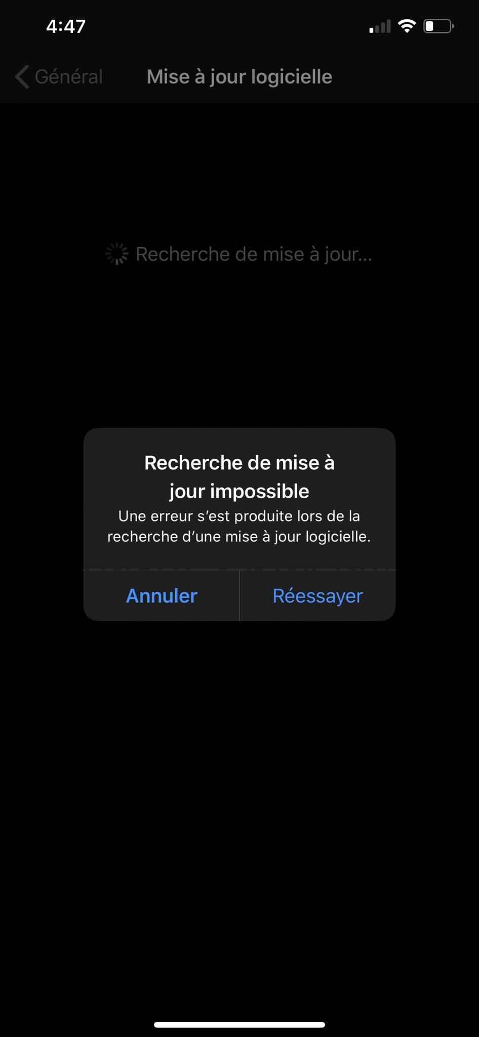 Si vous vous connectez avec un VPN, désactivez le. Essayez également sur un autre réseau Wi-Fi. Sinon connectez votre iPhone à votre ordinateur et faites la mise à jour depuis le Finder (Mac) ou iTunes (PC).