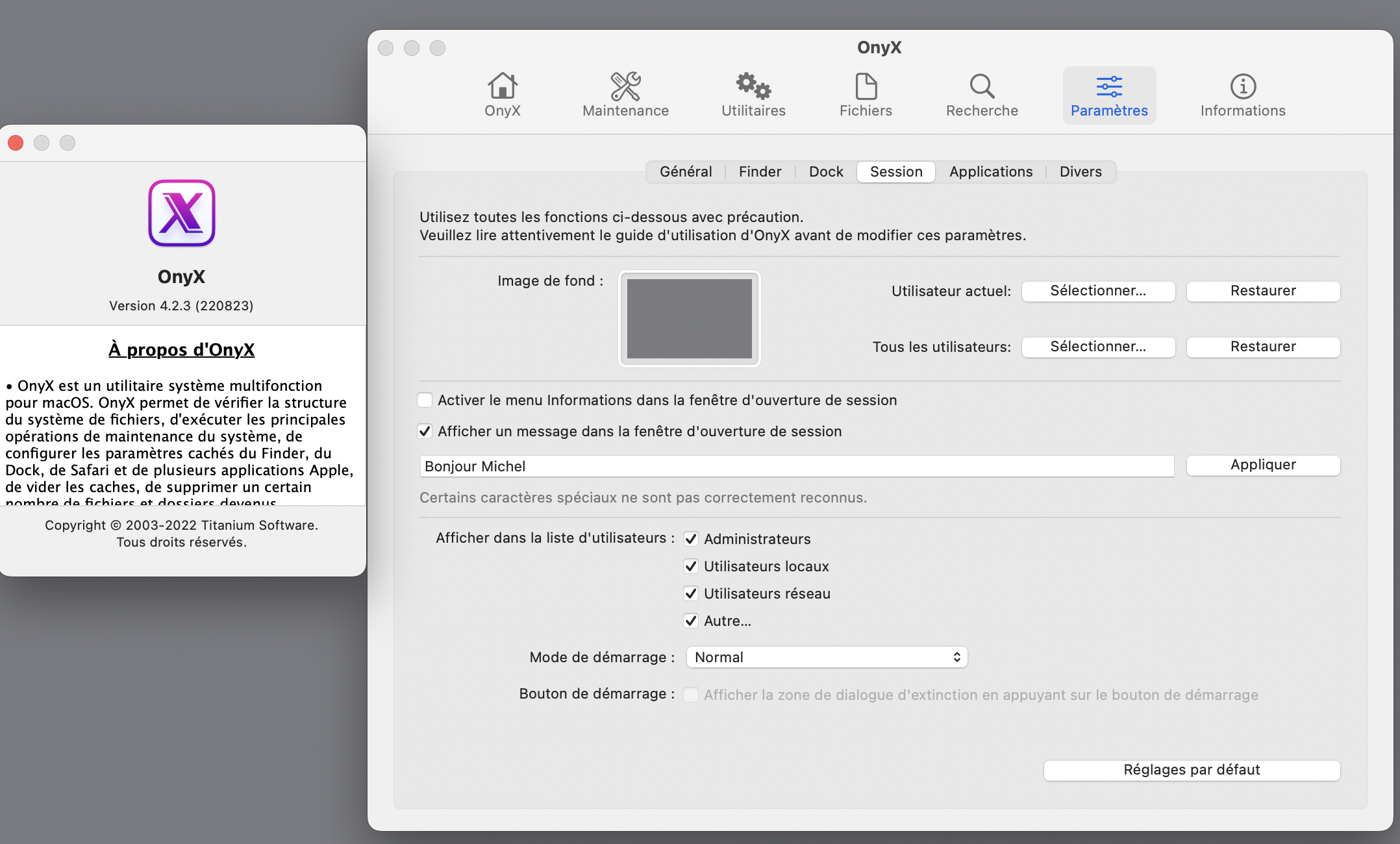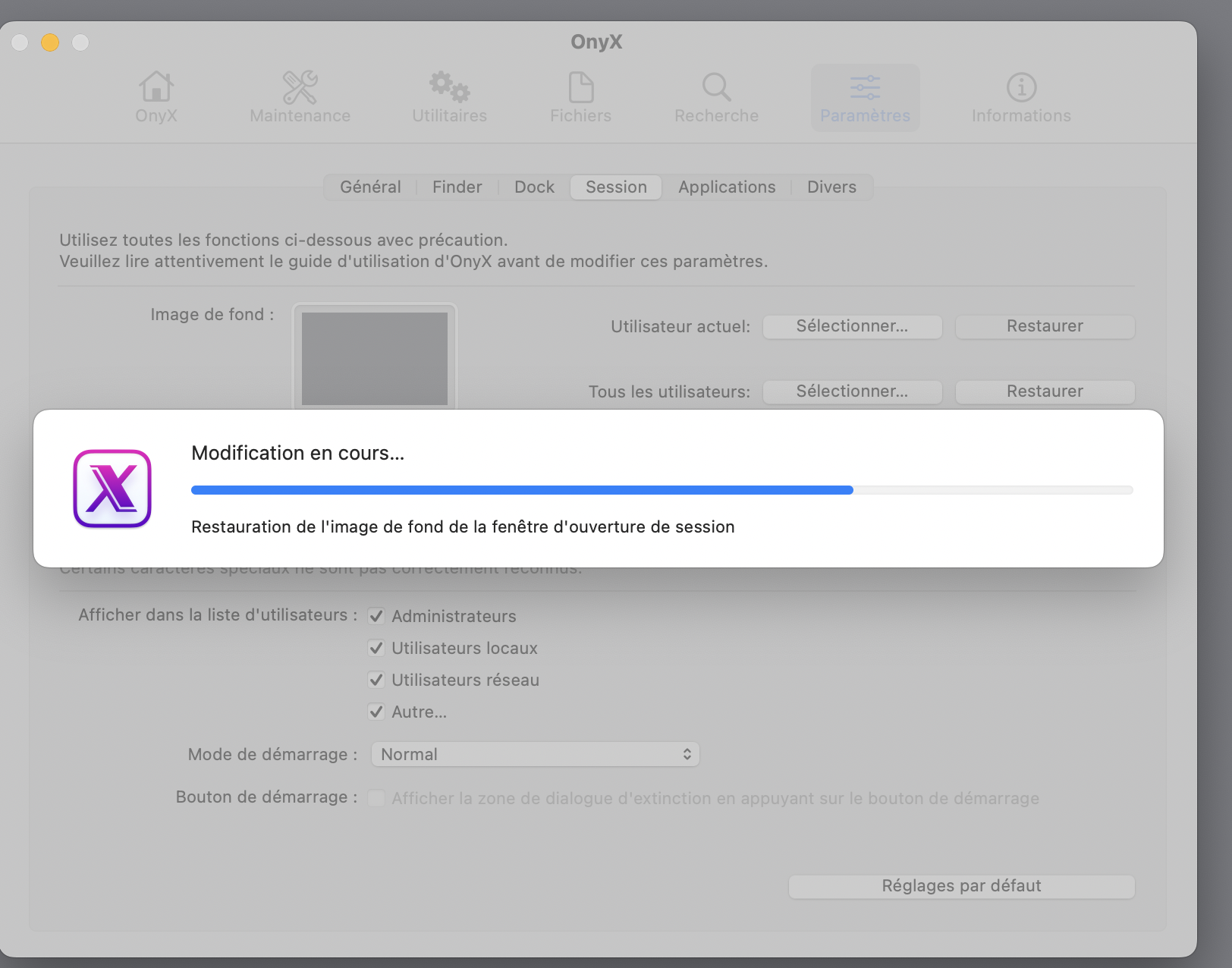 En effet, toutes les réponses ne font que parler du fond d'écran à l'ouverture de session, désolé pour vous tous, mais je sais parfaitement comment faire avec l'aide d'ONYX mais il ne s'agit pas de cela !