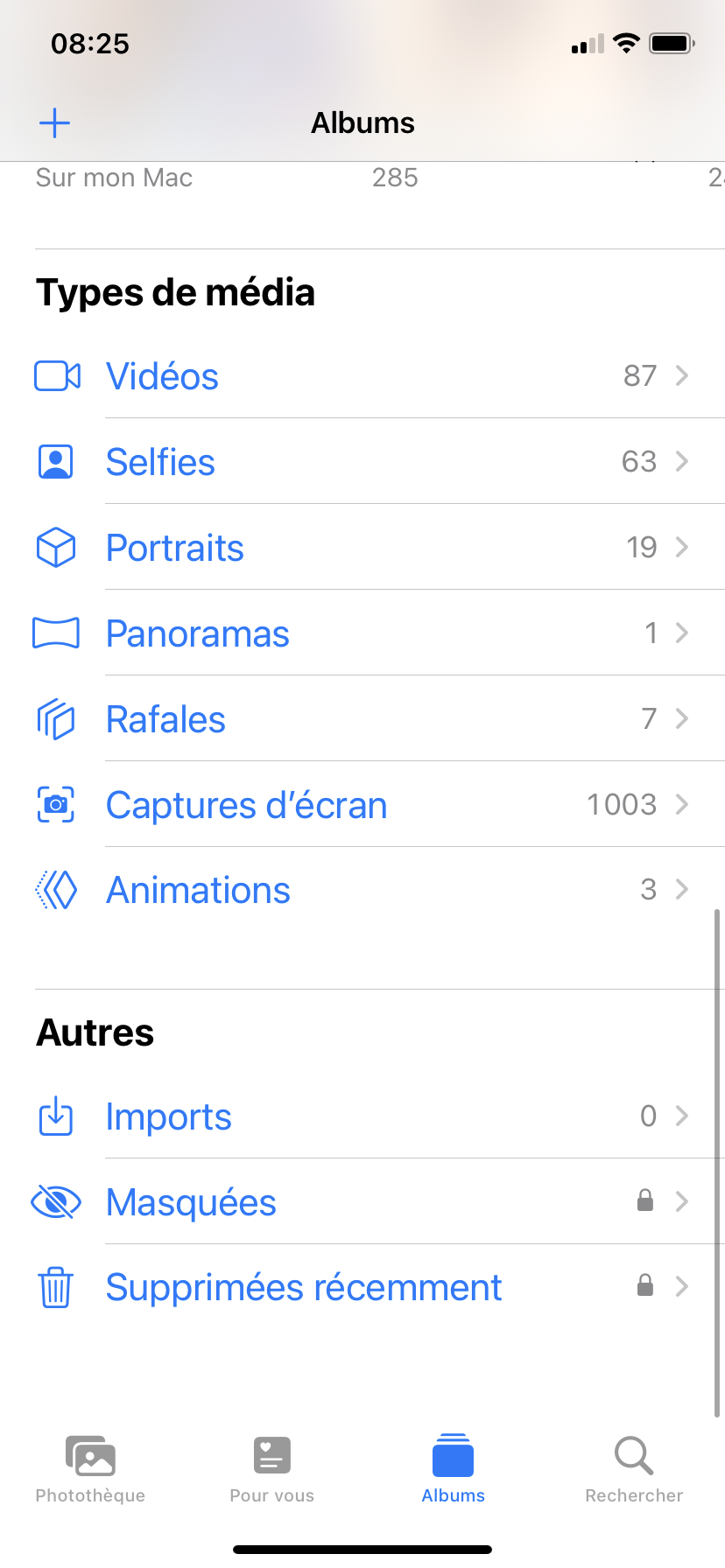 L'album Doublons dans l'application Photos apparaît sous Autres lorsque Photos détecte des doublons dans la bibliothèque.