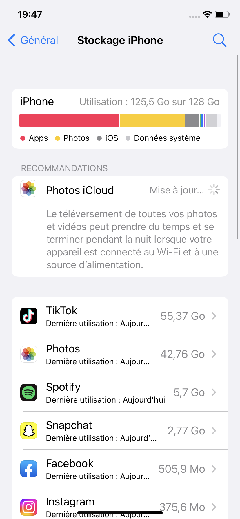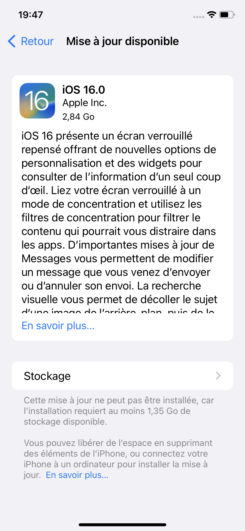 Je ne peu pas faire la mise à jour puisque je n’est supposément pas assez de stockage. La mise a jours demande 2,5 Go et je suis actuellement à une capacité de 125,5 sur 128 pourquoi je ne peu pas la faire?