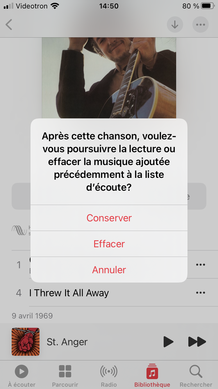 Si c'est le cas et que tu n'as pas poursuivi la lecture de cette liste d'écoute, tu te retrouves avec ce genre de message lorsque tu ouvres à nouveau Musique.