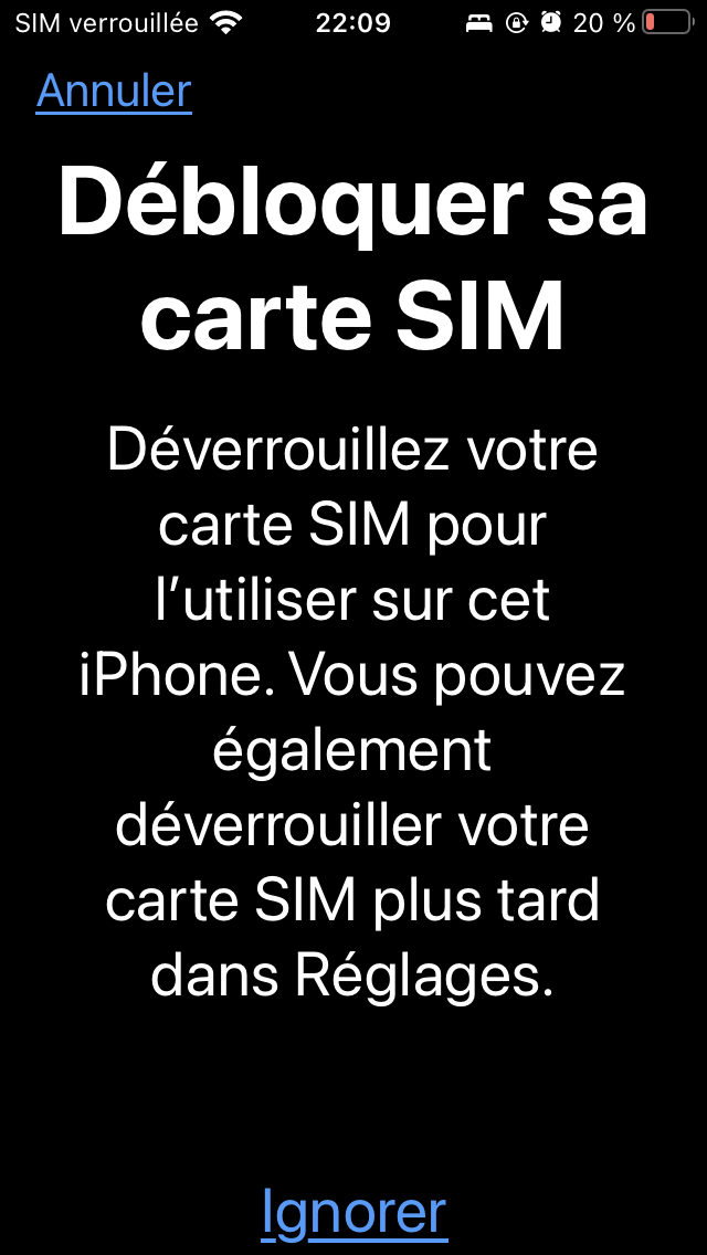 après installation d'IOS 16, je rentre le code de mon Iphone et puis vient la page pour saisir le code SIM. Or apparait une annonce: Débloquer sa carte SIM. Déverrouillez votre carte SIM pour utiliser cette iPhone. Vous pouvez également déverrouiller votre carte SIM plus tard dans Réglages. Pas moyen de saisir de code, parcontre il y a une touche en bleu pour 'ignorer' puis apparait une page pour modère le code SIM, mais tout est 'grisé'. .cf photos jointes