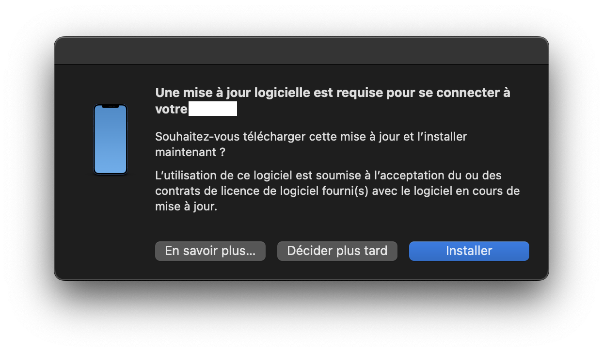 Si oui, il ne s'agit pas d'une mise à jour de macOS, mais du logiciel qui permet au Mac de "comprendre" l'iPhone. J'ai eu cette fenêtre récemment, après avoir mis mon iPhone à jour, alors que mon Mac ne l'était pas. J'ai téléchargé cette mise à jour, et mon Mac est bien resté sur sa version actuelle.