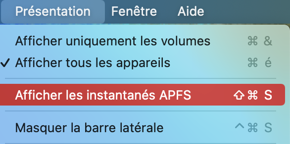 "Utilitaire de disque" "Présentation" "Afficher les instantanés APFS"