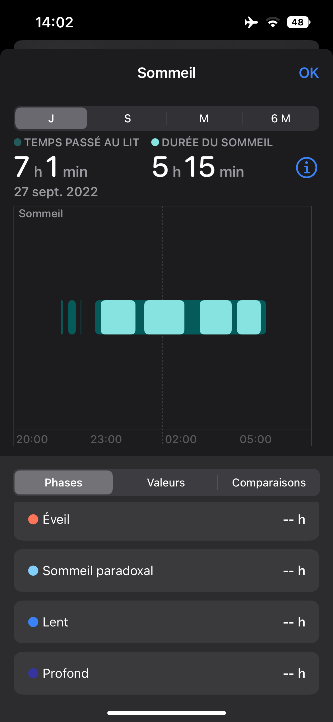 J'utilide en plus de l'app Santé l'app Autosleep qui elle m'indique bien les phses de réveil, de sommeil léger et profond.