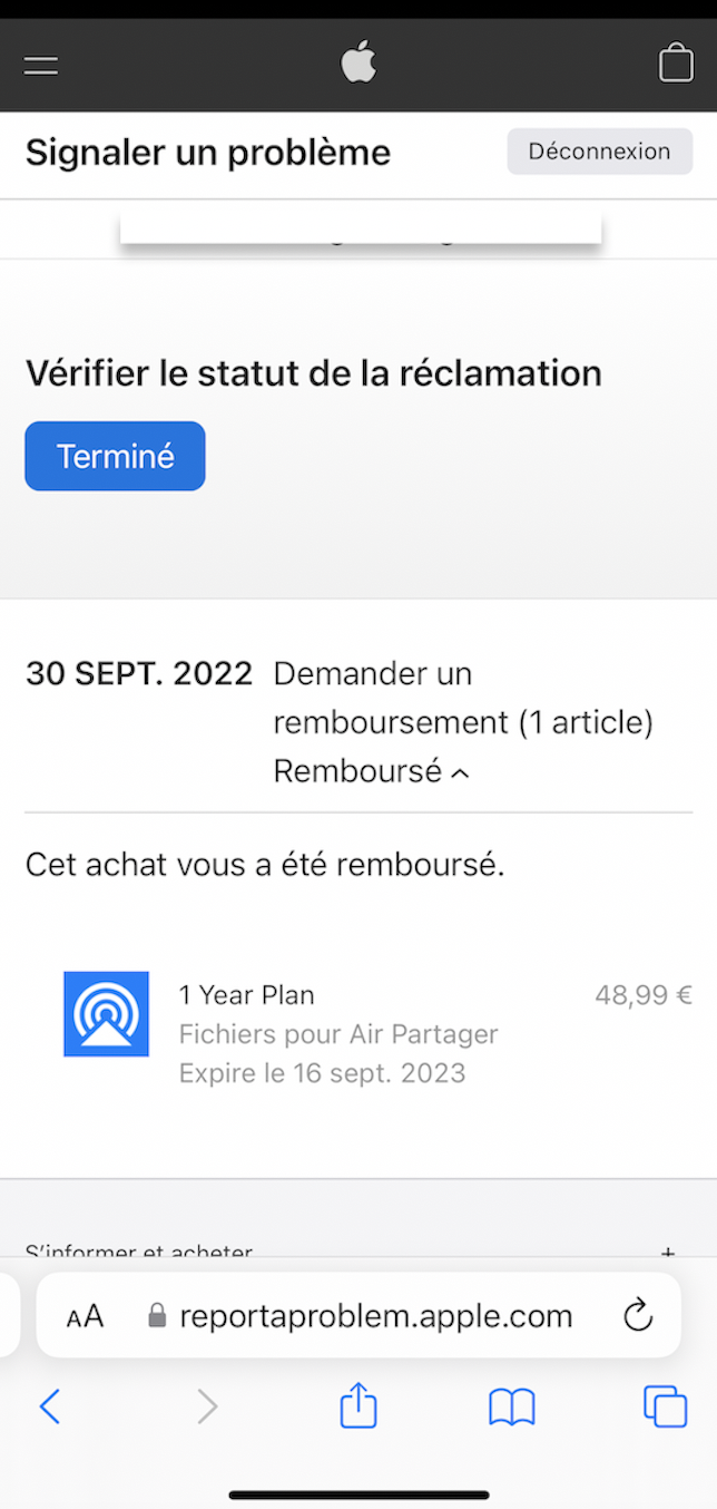 Un achat de 48,99 à été effectué sur App Store j’ai demander à être remboursé et Je n’est toujours pas eu le remboursement (sachant que sur cette photo, il a été marqué remboursé)