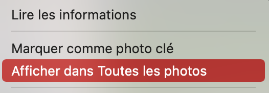 Si tu sélectionnes une photo depuis un album, un clic droit peut retrouver son emplacement dans la Photothèque.