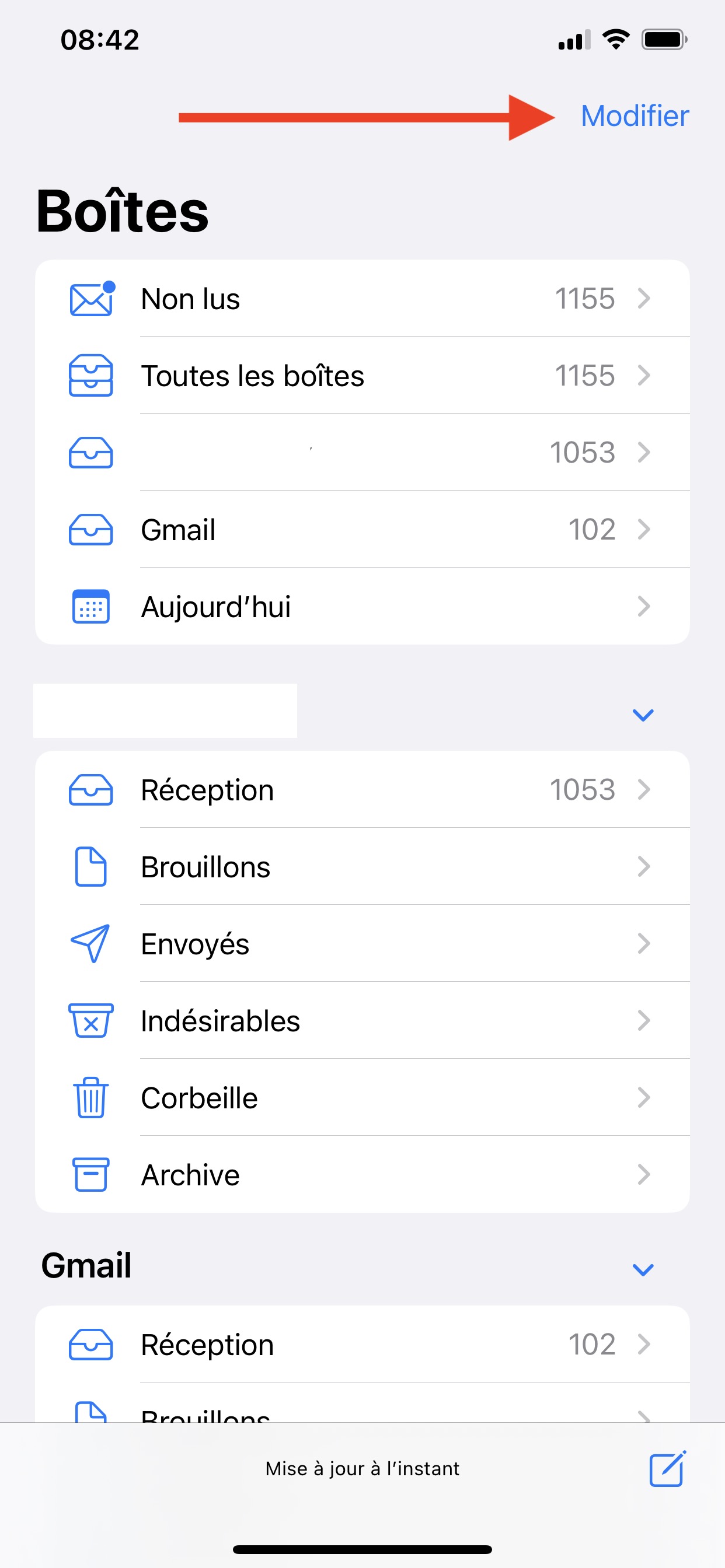 Pour cela, il faut que tu sois dans l'app Mail et sur la page "Boîtes" (et non pas sur tes e-mails, dans une boîte) puis que tu cliques en haut à droite sur Modifier.
