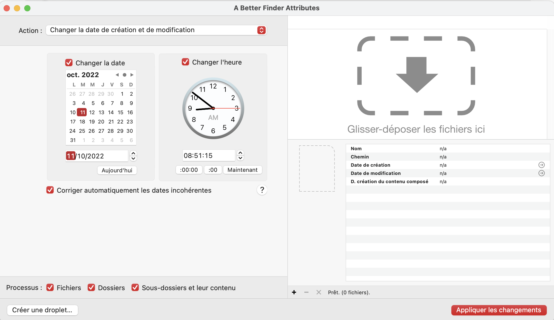Ensuite tu repasses par le terminal touch -mt199909172350 "fichier" et les deux dates ont changées.