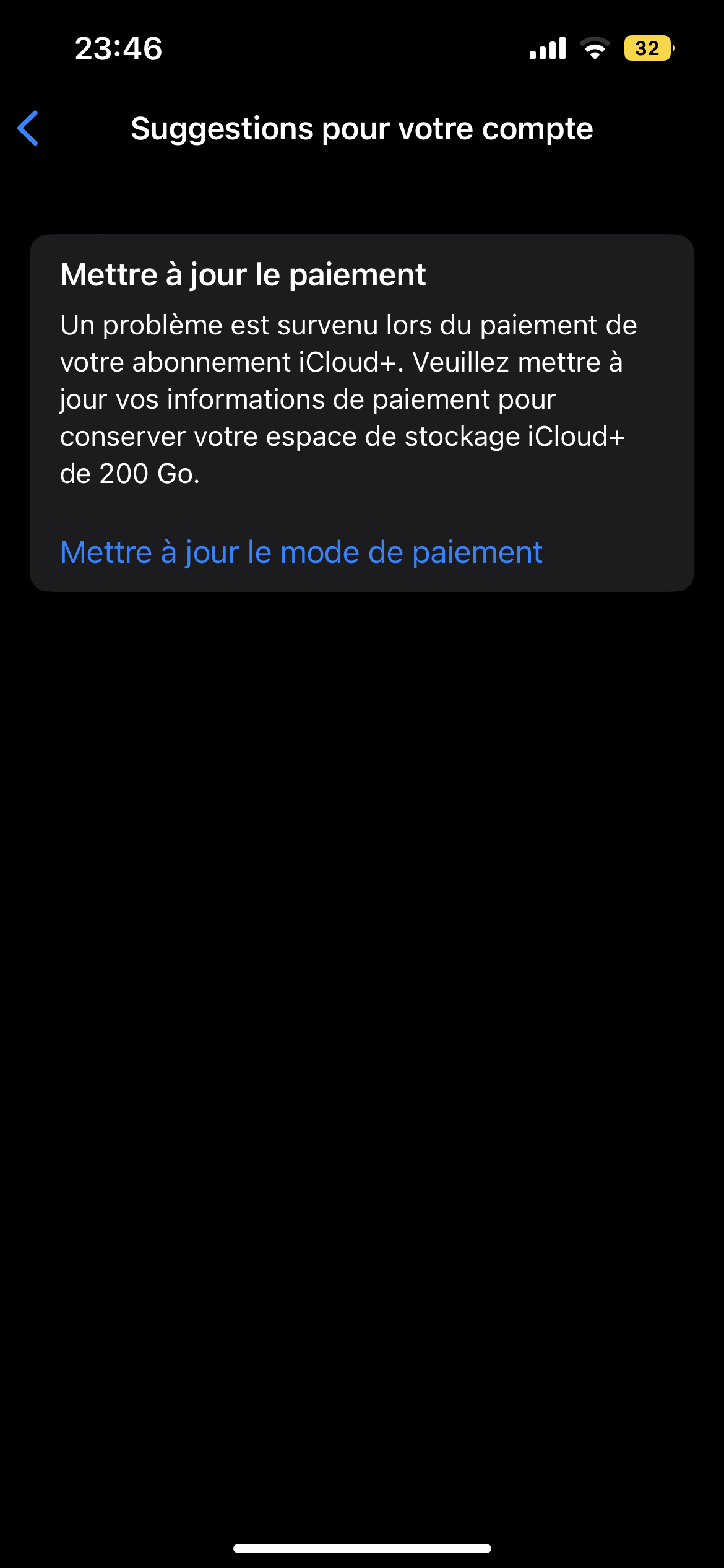 Ma carte de paiement enregistrée sur l’iCloud n’était plus à jour et mon paiement n’est donc pas passé, j’ai donc modifié et remplacé la carte par une nouvelle, mais depuis la notification « mettre à jour le paiement » reste active dans mes paramètres, et je ne comprend pas pourquoi, ni que faire, sachant que mon moyen de paiement a déjà été changé.