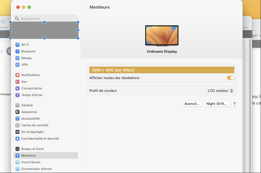 Bonjour Ventura s'est installé sur mon Macbook depuis je n'ai plus qu'une seule résolution d'écran en 42 pouces et en cliquant sur afficher toutes les résolutions je n'ai rien qui apparait pour changer la résolution