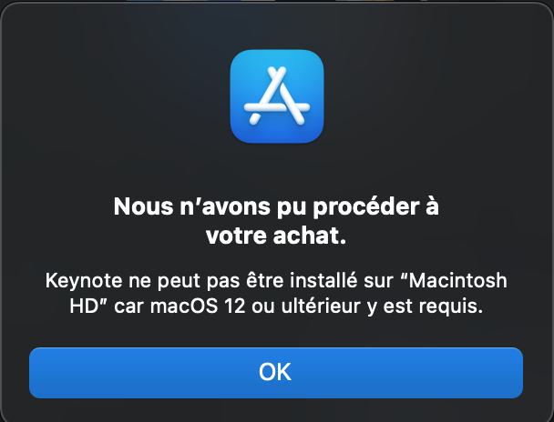 bonjour, récemment j'ai voulu installer keynote sur mon Mac mais dès lors, celui-ci m'affiche un message comme quoi je devrait passer a la version 12 de macOS. Mon Mac étant ancien, il supporte les versions jusqu'à macOS Big Sur. je n'arrive pas a palier a ce problème. merci