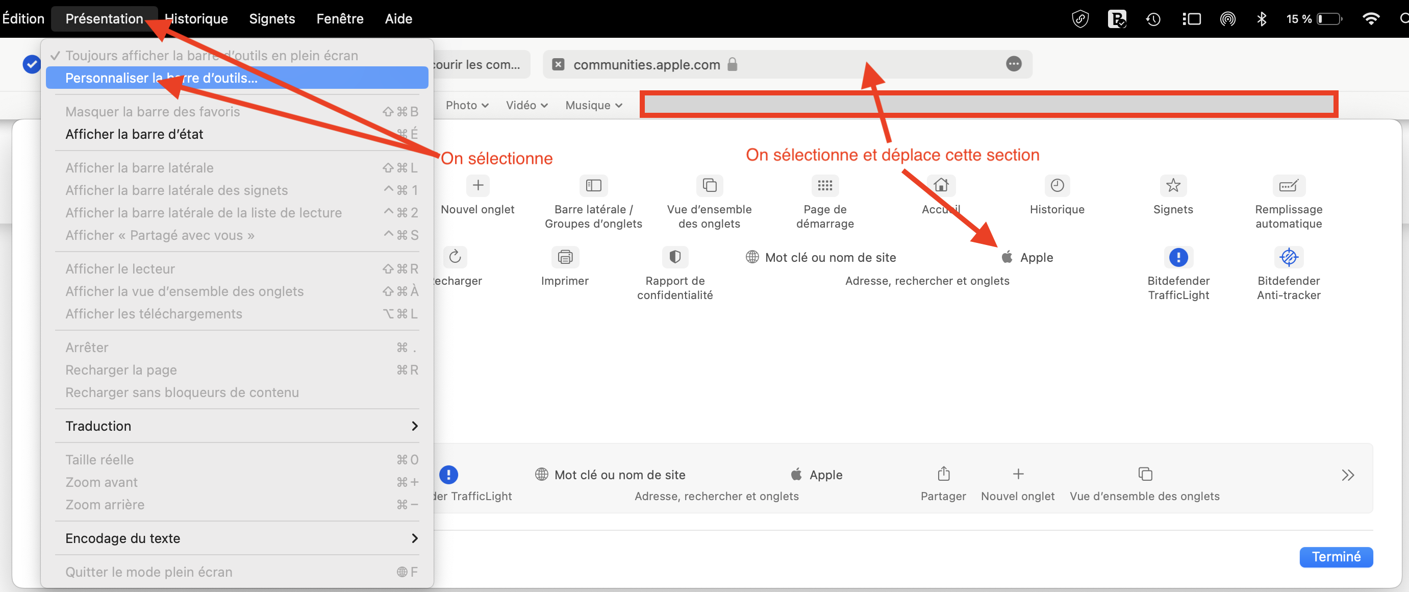 Après avoir récemment mis à jour MacOS vers Ventura. J'ai voulu personnaliser la barre d'outils de Safari en vue compacte. Ayant par erreur enlevé la barre d'URL et sauvegardé, j'ai voulu la restaurer en retourner dans les paramètres de la barre outils. Mais impossible depuis d'y accéder, les icônes tremblotent comme si j'y étais mais la fenêtre n'apparait pas.
