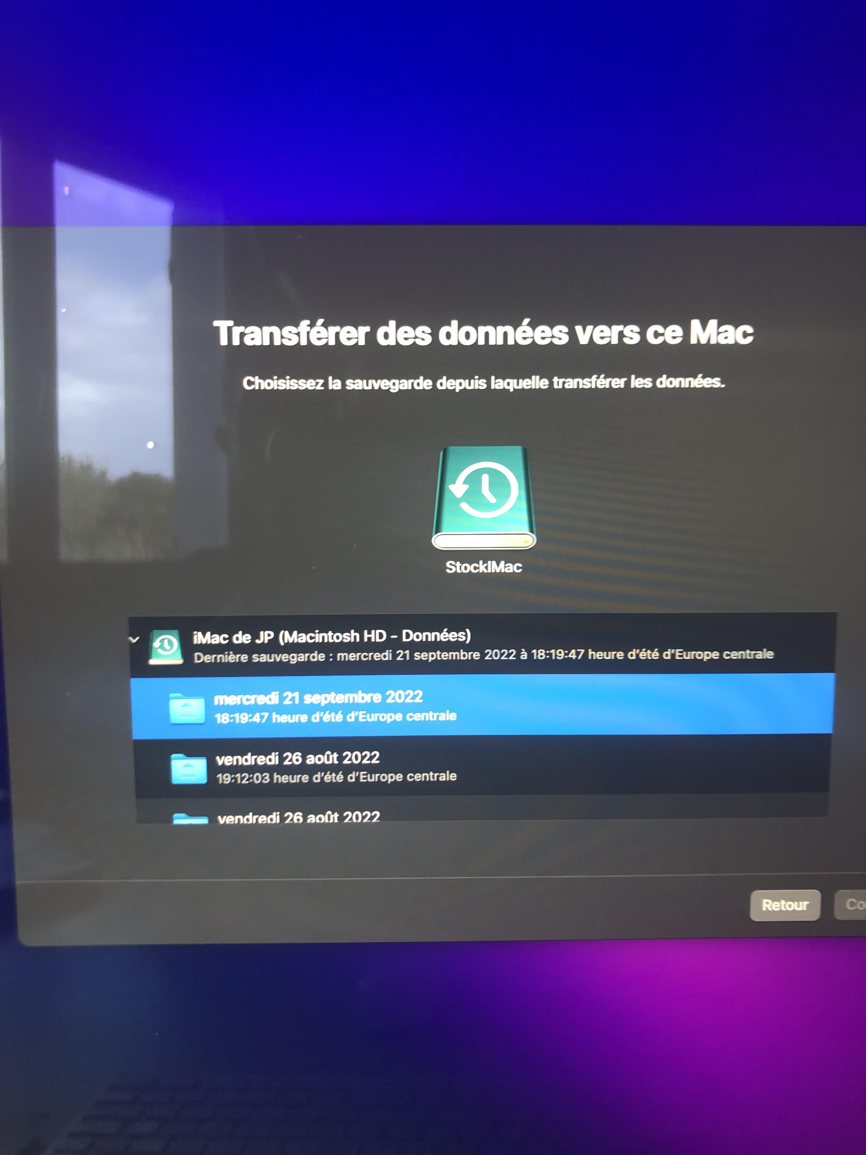 On peut voir que le bouton Continuer est grisé. Si tu choisis la sauvegarde du vendredi 26 août, est-ce que le bouton devient actif ?