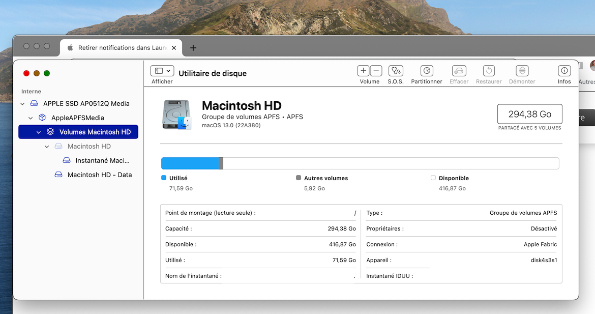 • Macintosh HD -> Groupes de volumes APFS soit la section du disque dur contrôler par macOS et formater en APFS