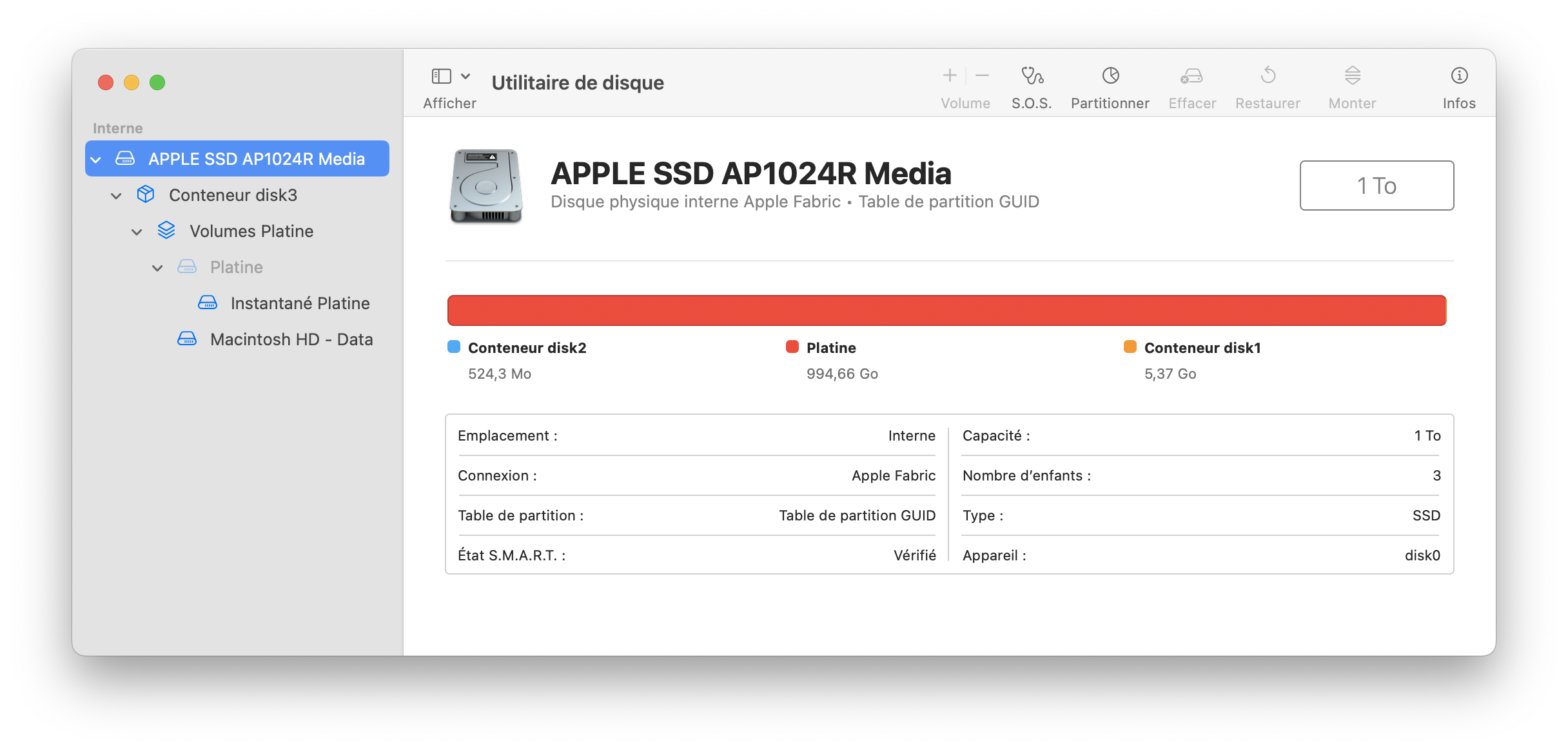 • APPLE SSD AP0512G Media -> Disque physique interne Apple Fabric - Table de partition GUID soit une description physique de ton disque interne (AP0512G pour un disque de 512Go) et de sa table de partition soit un seul block rouge pour macOS et une petite orange pour la section de démarrage de ton Mac