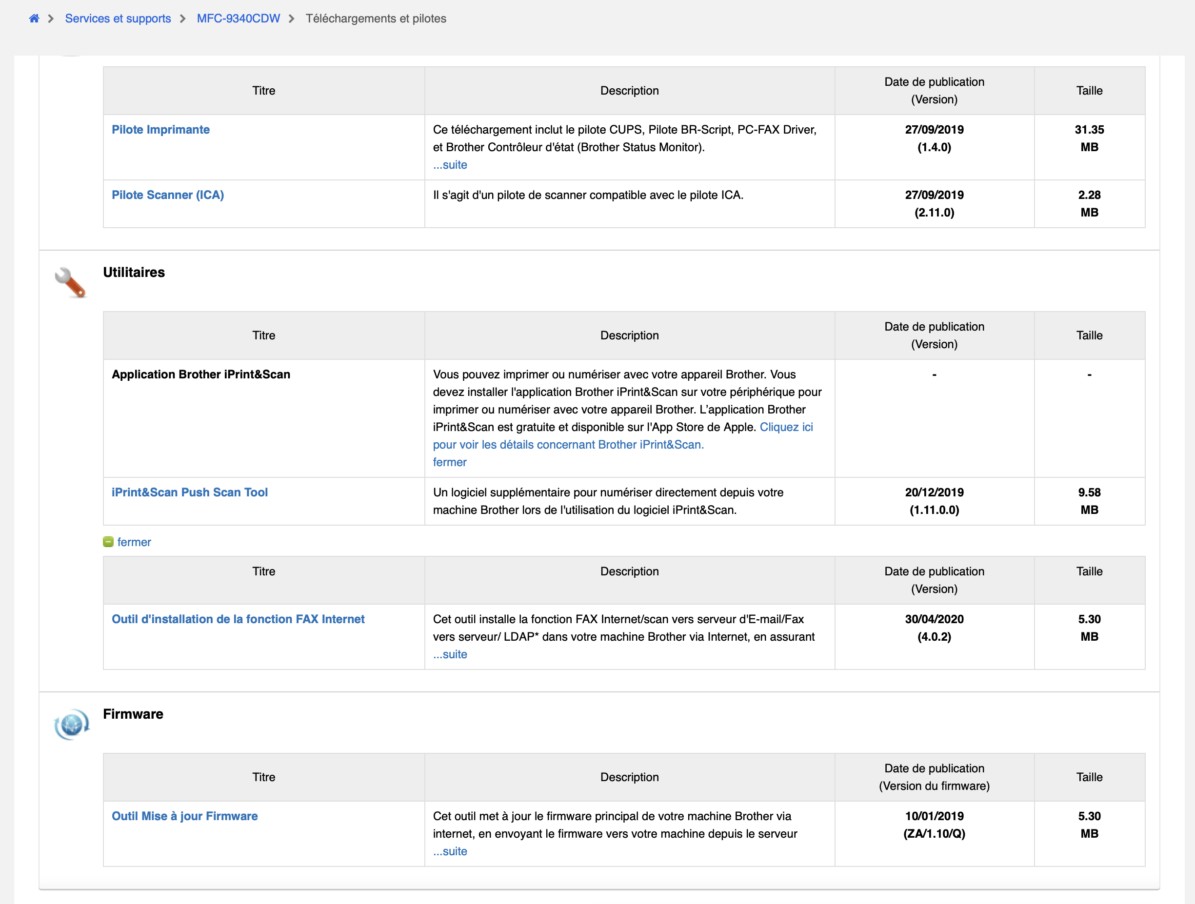 Je suis allée sur le site de Brother qui ne propose aucune mise à jour pour ma Brother MFC-9330CDW depuis 2019!