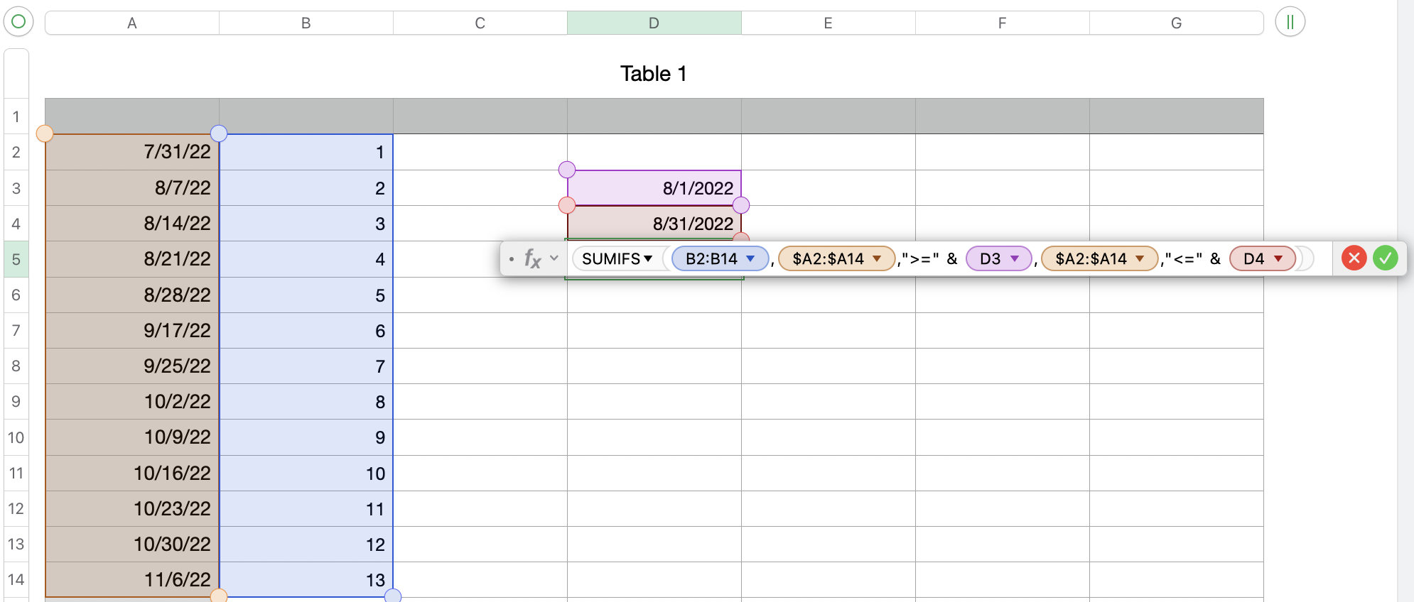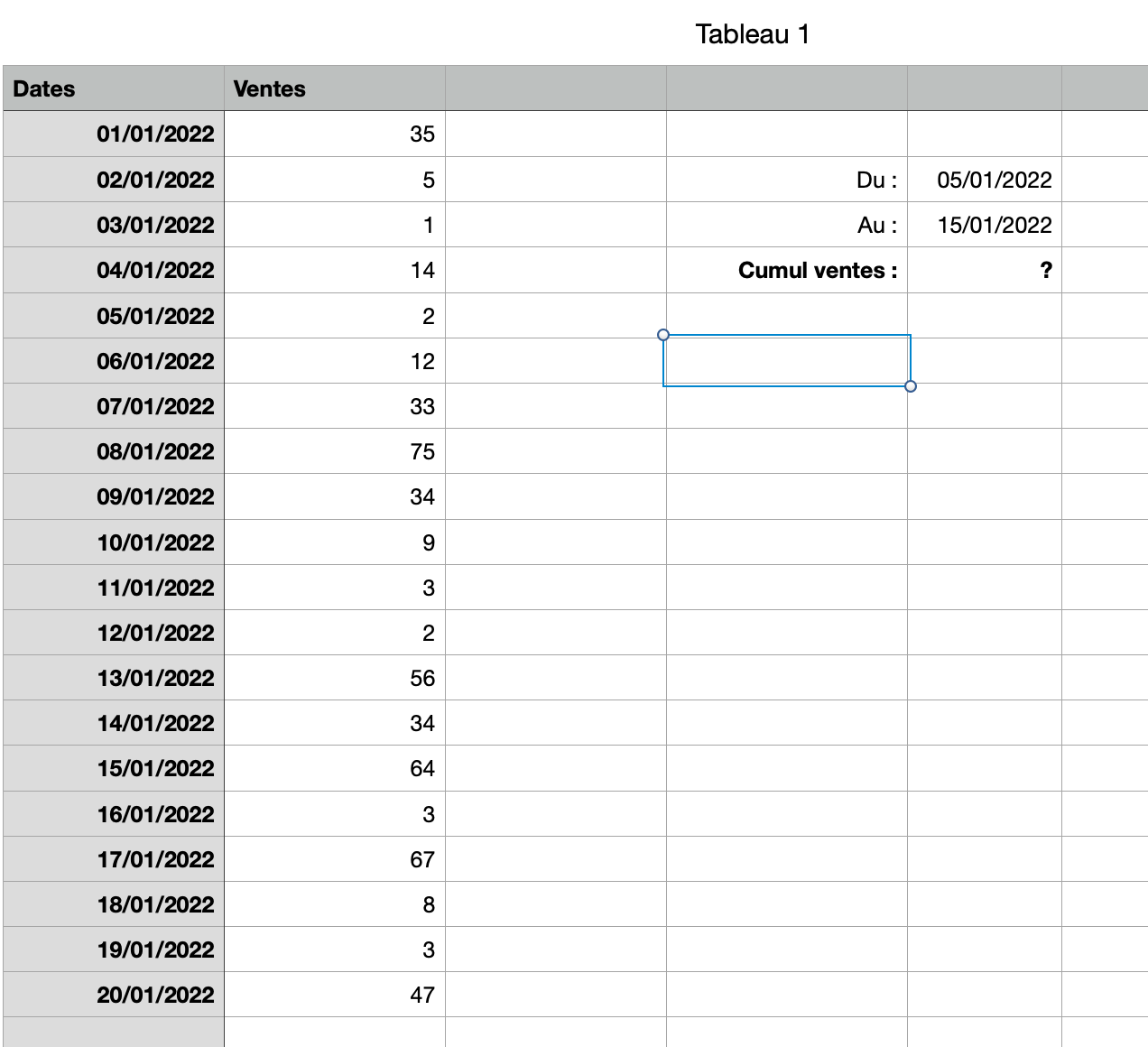 Je souhaiterai cumuler le nombre des ventes entre 2 dates aux choix (c'est plus clair sur la photo 😉). Quelle formule dois-je utiliser ? (la réponse doit être 324)