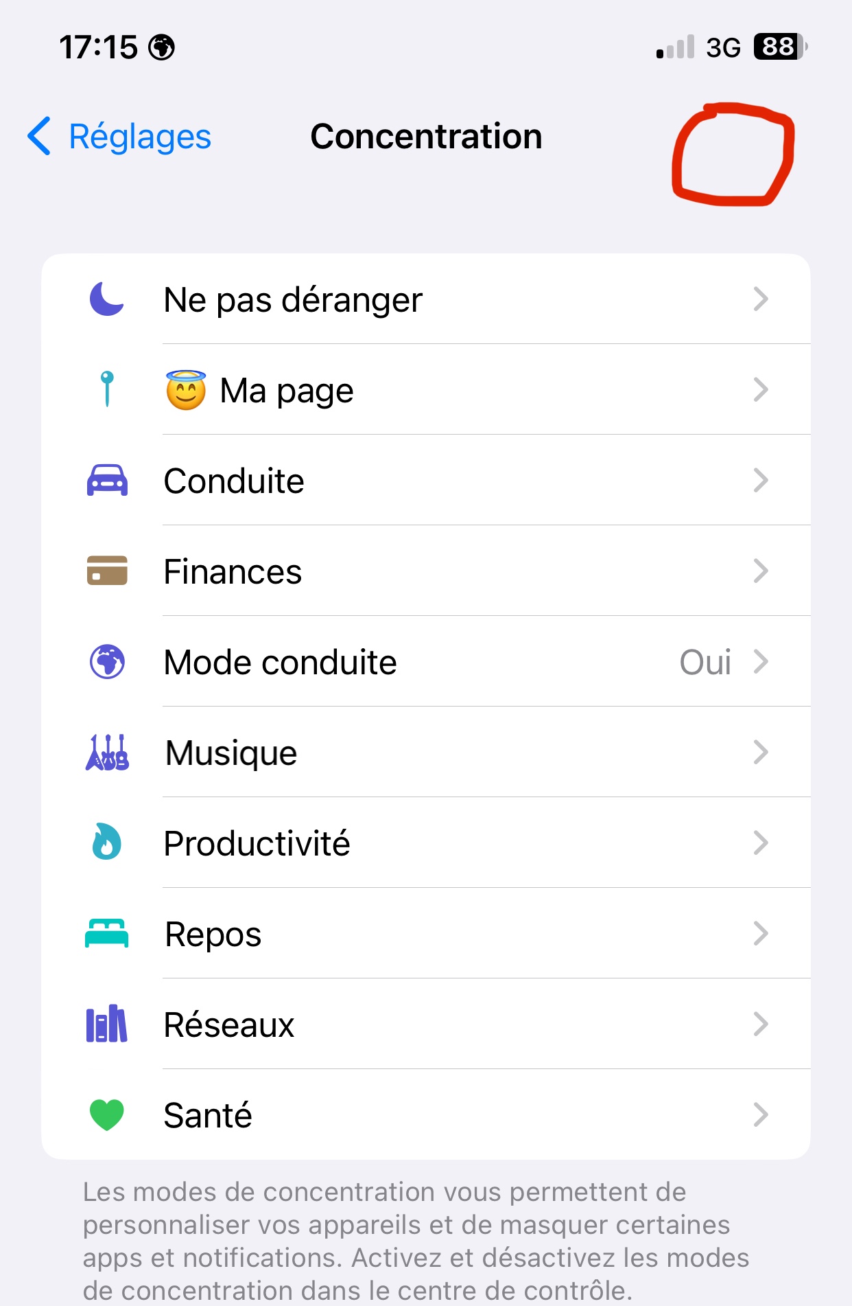 En effet, je vois grâce à ta capture d’écran que tu as créé plusieurs modes de concentration personnalisés en fonction de tes activités et je souhaite faire de même. Cependant, lors du paramétrage de ces modes de concentration personnalisés créés, pour l’écran d’accueil, je n’ai pas la possible de créer les pages avec les applications que je souhaite, je peux uniquement sélectionner les pages d’écran existantes. Est ce que tu me confirmes que c’est impossible de créer une interface unique à un mode de concentration ou bien as tu une astuce ? (Si ce n’est pas clair, tu peux aller voir directement ma question à la communauté sur mon profil et sinon je serais ravi de préciser ma demande)