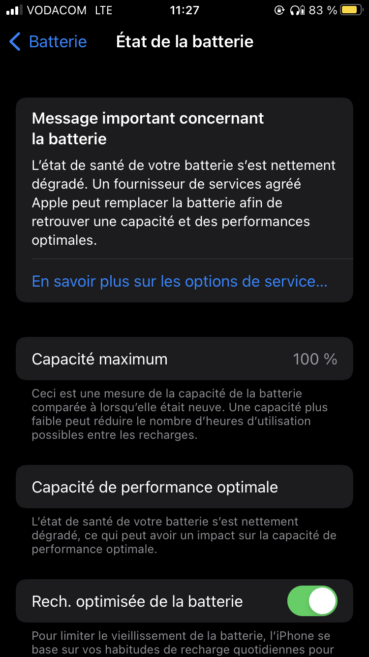 La capacité maximum de ma batterie est de 100% mais j’ai un message me signalant que l’état de santé de ma batterie s’est nettement dégradé.