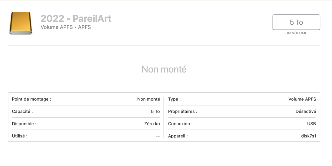 Et la j'ai un soucis, le seul DDE que j'ai en APFS, ne veux pas du tout être monté (peut importe la durée après plusieurs heures, l'option monté de Apple, redémarrer, changer de hub USB), pourtant il est reconnu, avec des softs de récupérations de data, je peux y avoir accès (mais je ne peux pas les récupérer comme j'ai que la version free du soft), mais impossible depuis mon mac, il me dit qu'il n'est pas monté mon DDE...