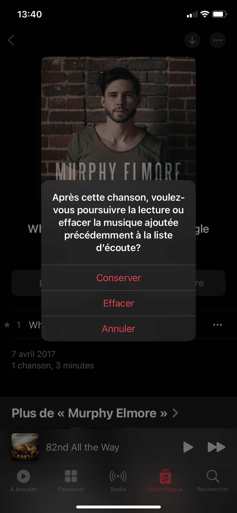 Normalement, ce message s'affiche quand tu veux ajouter une chanson à ta file d'attente avec l'option Lire ensuite. L'iPhone te demande alors si tu veux conserver la suite de ta file d'attente ou bien si tu veux la remplacer.