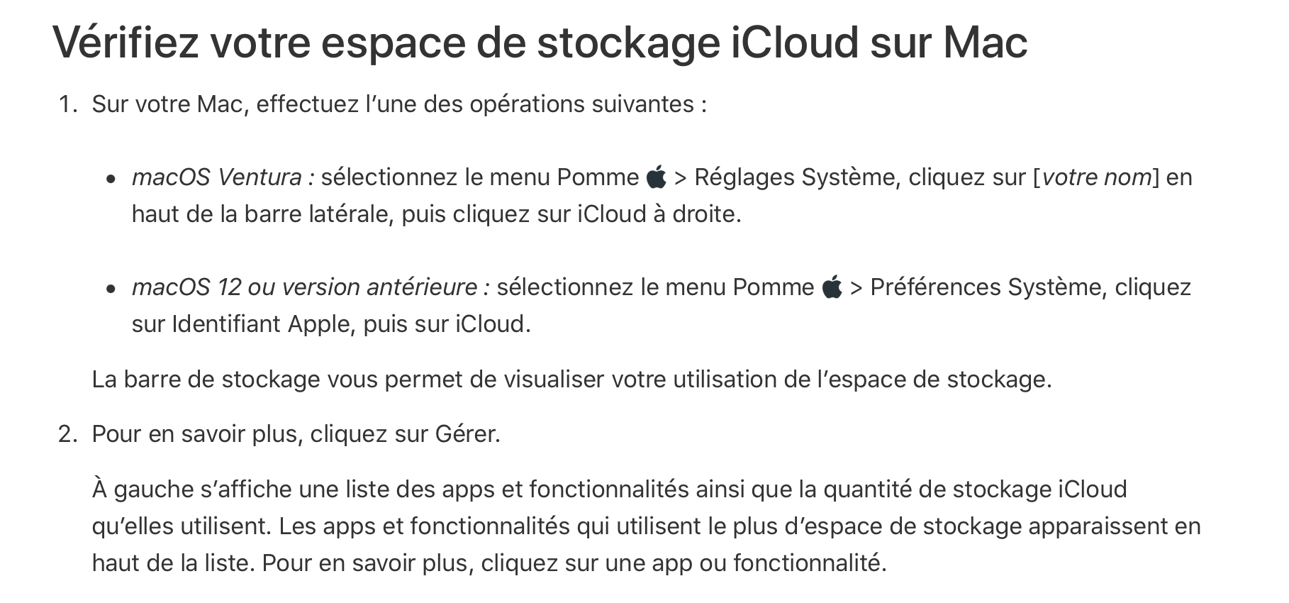 Peux-tu procéder à cette vérification sur ton Mac, puis nous envoyer une capture d'écran (sans donnée personnelle) des informations concernant ton stockage iCloud ?