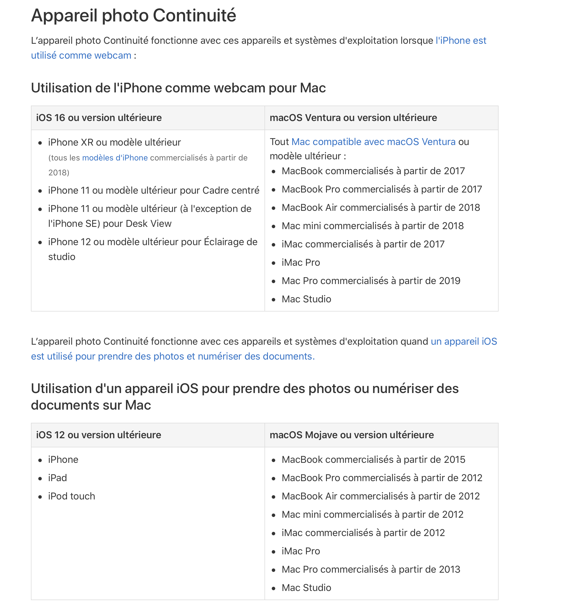 J'ai un iPhone 13 pro et je souhaite utiliser mon iPhone comme camera sur mon Mac qui a la version Ventura. Dans les réglages Airplay Handoff, je n'ai pas l'option Appareil photo continuité, nécessaire pour utiliser l'iPhone en camera. Que dois-je faire ?