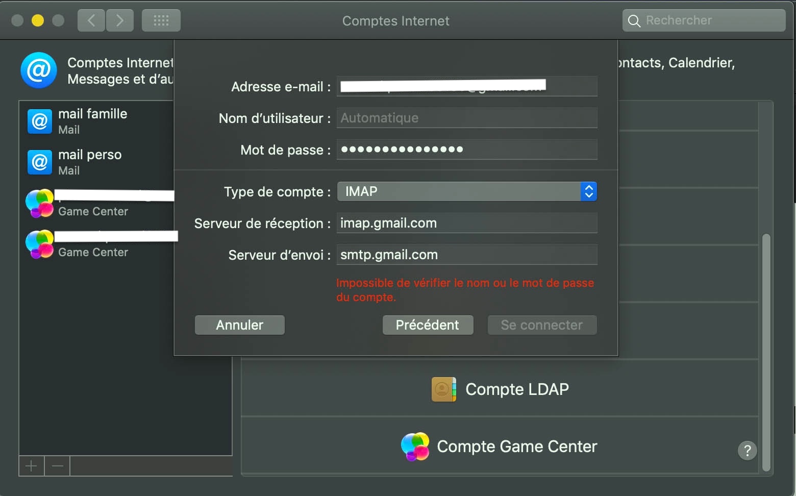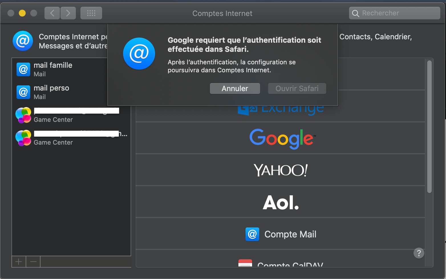 Suite à l'erreur d'un technicien Apple, qui a provoqué la disparition de mon compte Gmail dans Mail, il m'est impossible de recréer ce compte. A chaque fois que j'essaie, lorsque je clique sur Safari pour l'accès à l'autorisation de Goggle, il ne se passe rien et Safari ne s'ouvre pas, ce qui rend impossible sa création. Idem lorsque je veux créer directement un nouveau mail et que je rentre mon adresse Gmail et mon mot de passe, le message d'erreur indique qu'il est impossible de vérifier ces données. Je suis sous Mac OS Mojave 10.14.6.