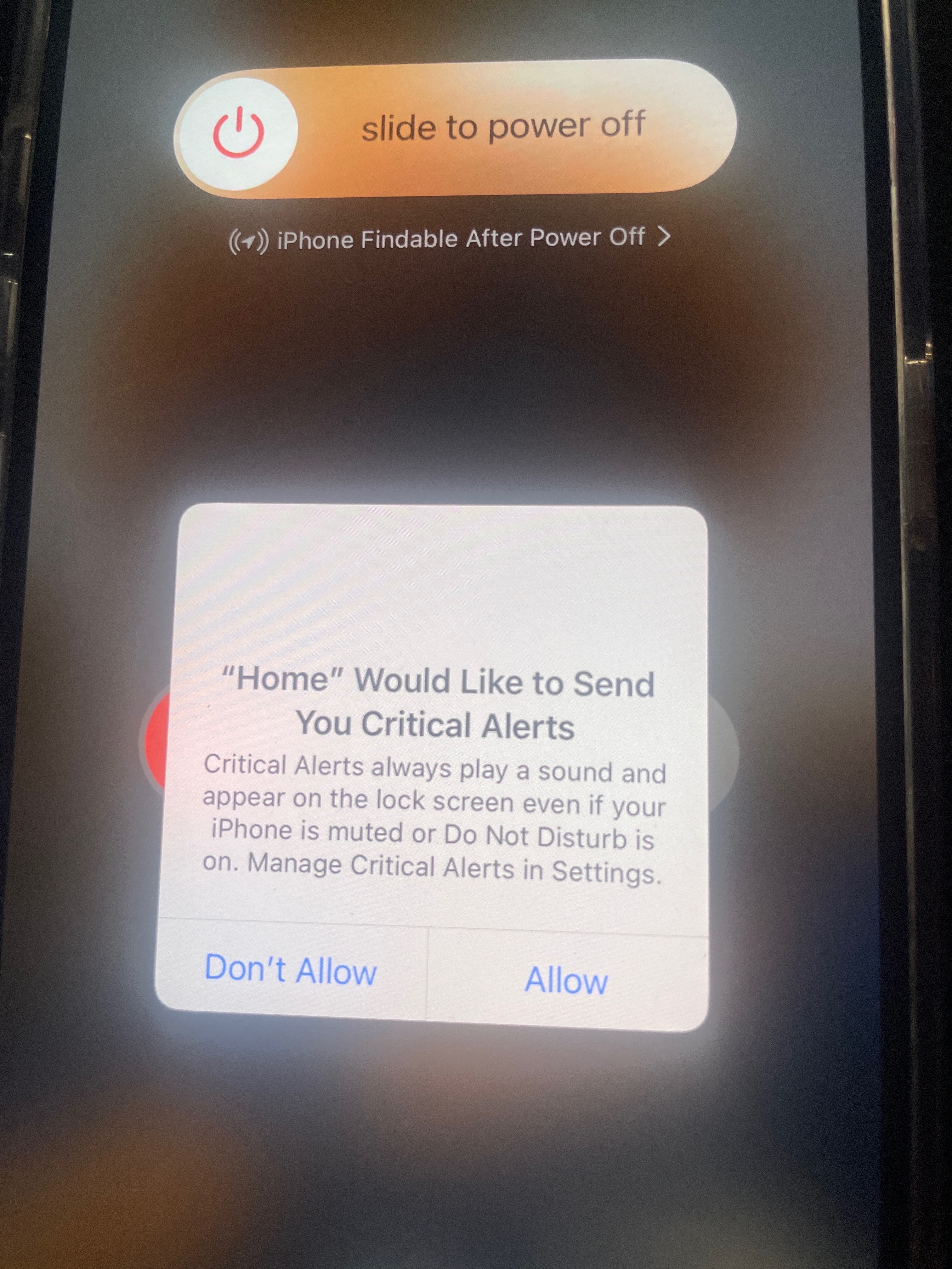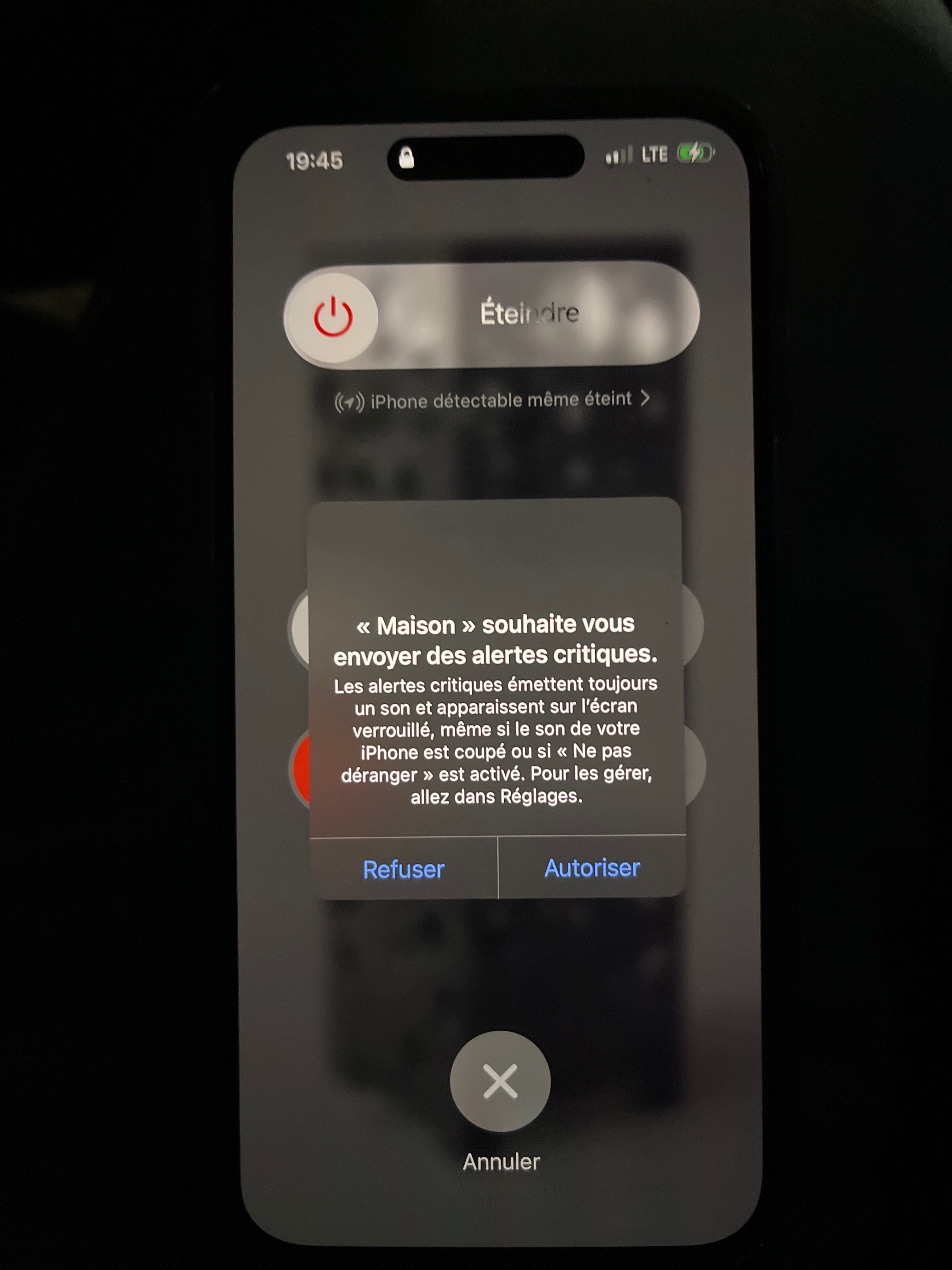 J'ai une notification sur mon téléphone : "maison" souhaite vous envoyer des alertes critiques. Les alertes critiques émettent toujours un son et apparaissent sur l'écran verrouillé, même si le son de votre iPhone est coupé ou si "ne pas déranger" est activité. Pour les gérer, allez dans réglages avec option : refuser ou autoriser. Cependant impossible de déverrouiller mon téléphone, de répondre à un appel ou éteindre mon téléphone.