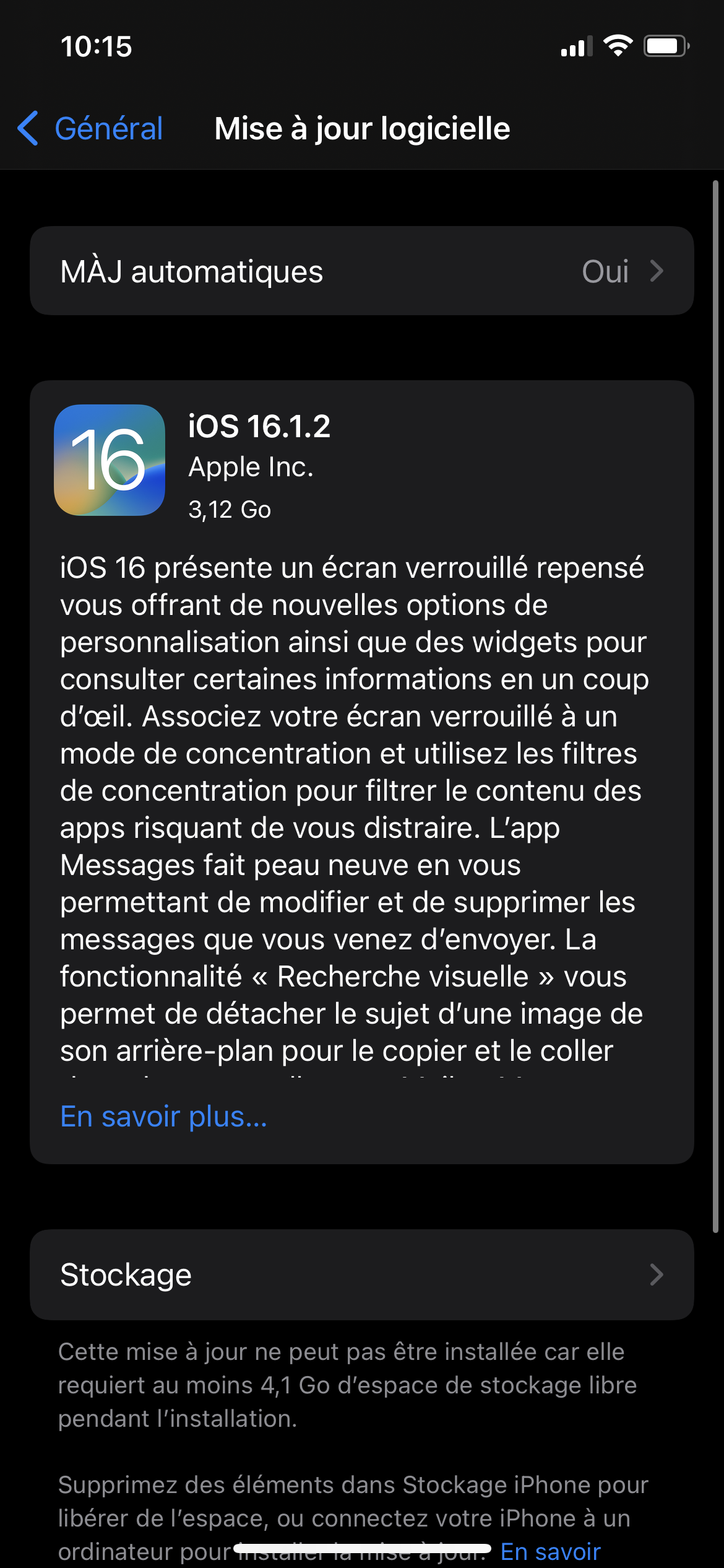 Faites de la place sur votre espace mémoire ou tentez de mettre à jour avec votre ordinateur.