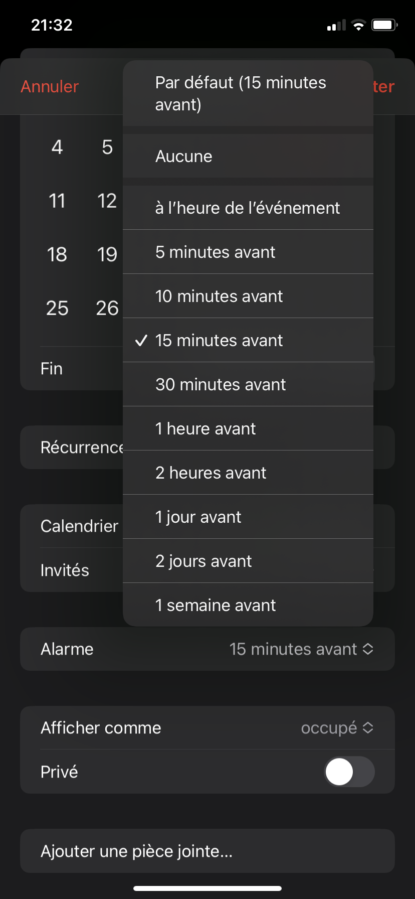 Lors de la création d’un nouveau rdv, dans les champs « Alarme », j’aimerais qu’on ajoute l’option « 2 semaines » comme sur l’appplication de bureau Outlook. Merci!