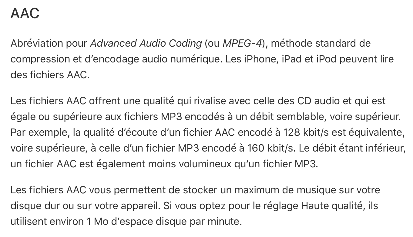 Lorsque tu achètes une chanson sur l'iTunes Store, elle va être au format AAC.