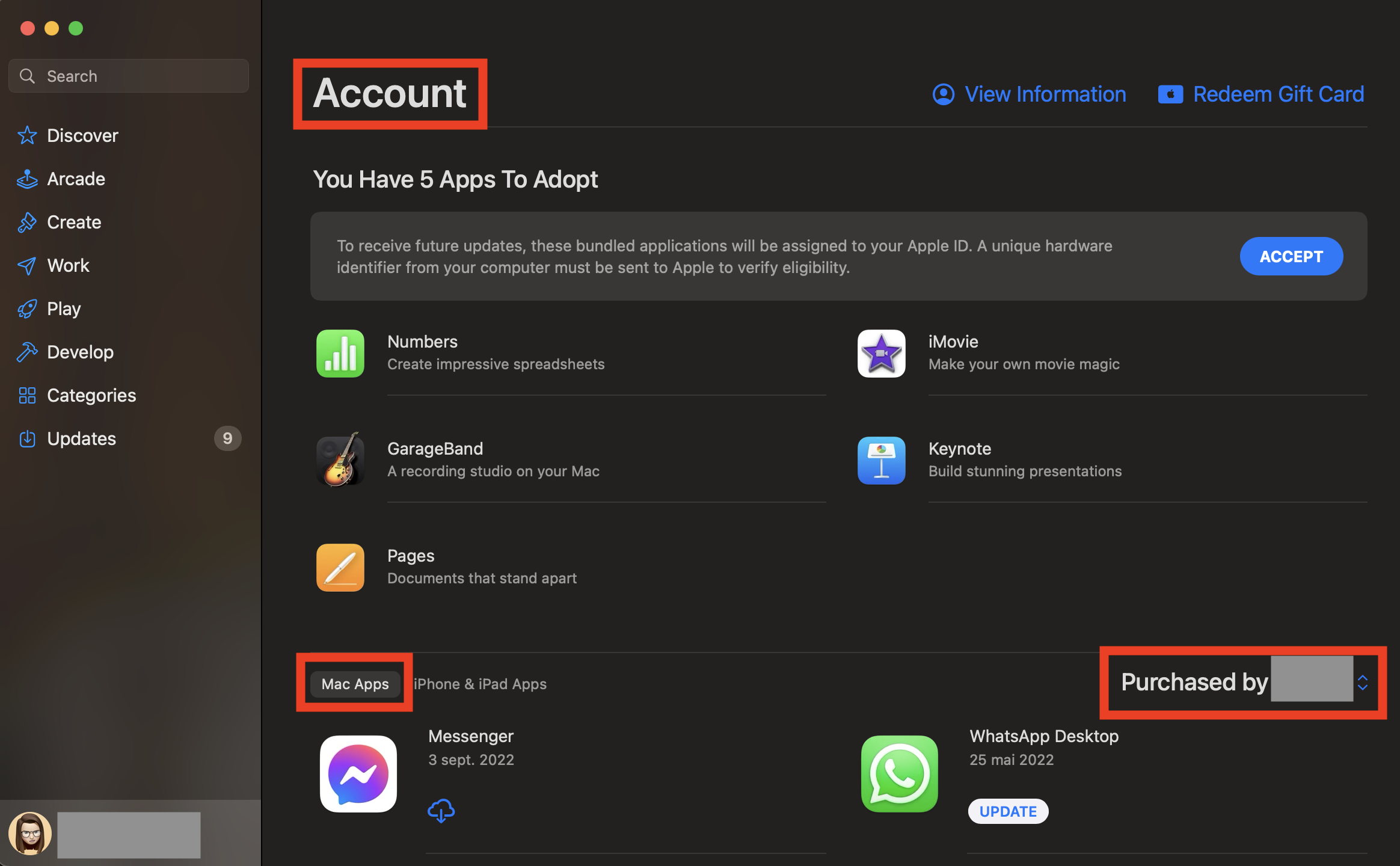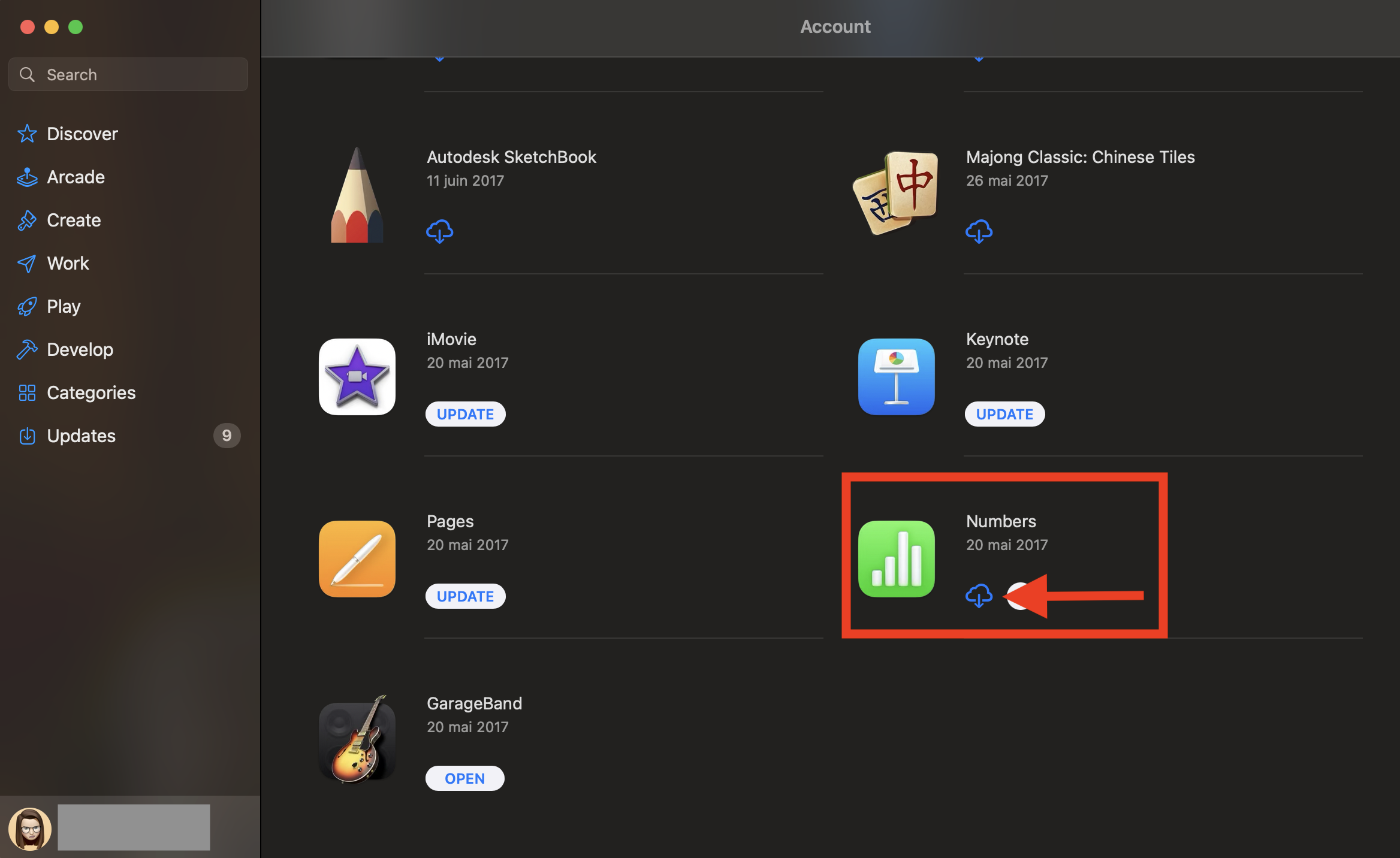 Si tu avais déjà téléchargé et installé l'app Numbers à partir de ton identifiant Apple, il se peut que tu puisses réinstaller cette app en passant par l'historique de tes achats. Pour cela, ouvre l'App Store sur ton Mac, clique sur ton profil en bas à gauche de l'App Store afin d'arriver sur la page Compte. Ensuite, regarde si tu trouves Numbers dans la partie Achetées par [ton nom]. Si tu trouves l'app Numbers dans l'historique de tes achats, clique sur l'icône du nuage se trouvant en face et regarde si tu parviens à télécharger une version compatible de l'app avec ton Mac. Pour simplifier ta recherche, clique sur l'onglet Mac Apps.