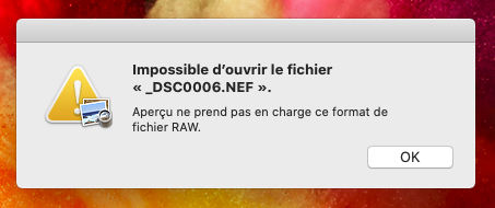 bonjour, alors que je lisais sans problème tous les fichiers RAW (NEF pour nikon) de mon boitier Nikon 7000 avec "aperçu", j'ai voulu lire des formats RAW de mon nouveau boîtier nikon Z5. J'ai un message qui s'affiche en me disant que "Aperçu" ne prend en compte ce type de fichier. Pouvez-vous me donner l'explication et ce qu'il convient de faire? Merci beaucoup