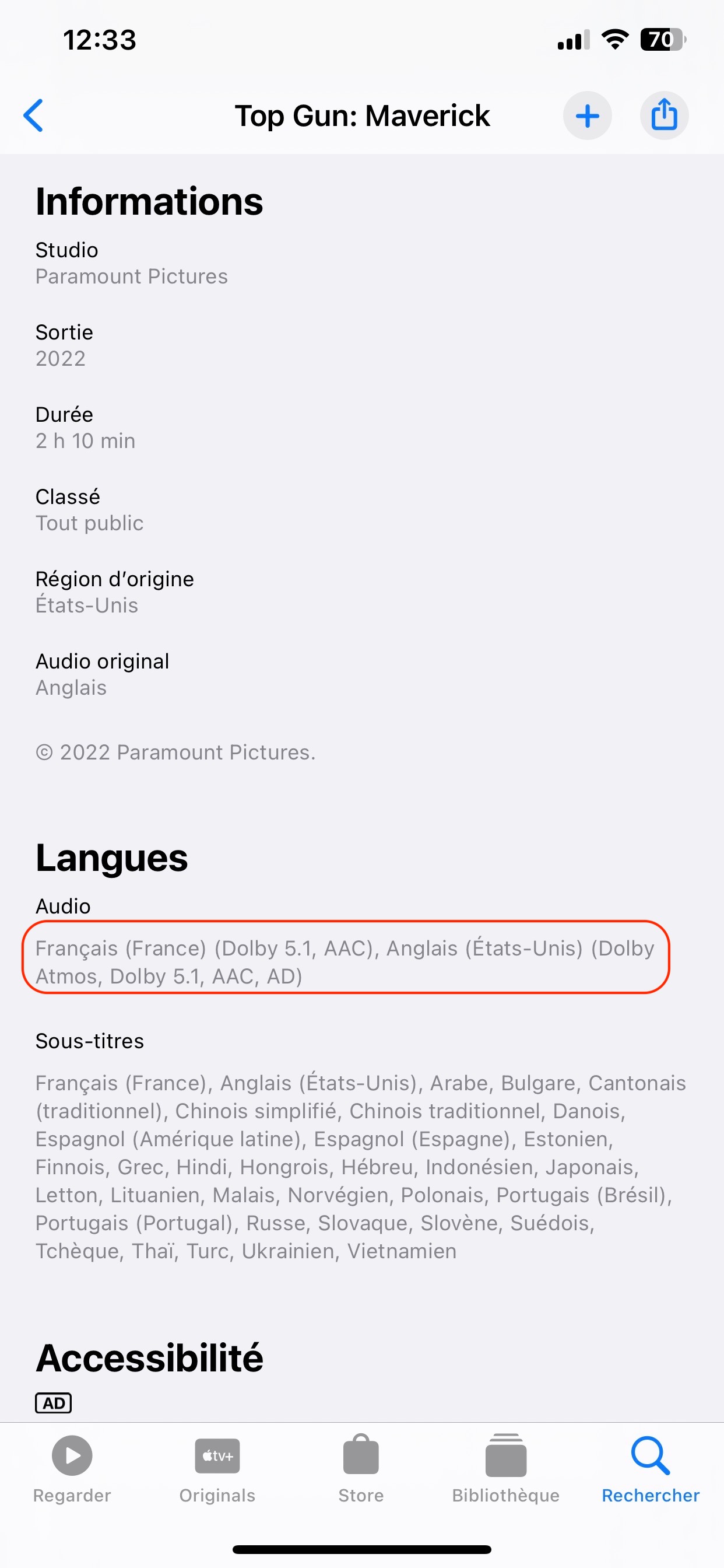 Je souhaiterais acheter Top Gun Maverick sur l’Apple TV, mais je ne vois pas de Dolby Atmos sur la VF alors qu’elle est bien disponible sur le Blu-Ray 4K.