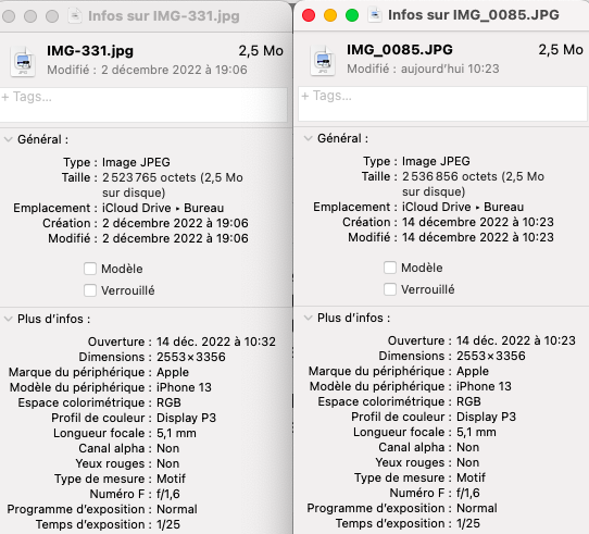 Je vous mets un exemple en capture. Il s'agit de la même photo, prise le 2 décembre, transférée la semaine dernière et aujourd'hui, exactement de la même manière. A gauche les infos de la photo exportée la semaine dernière, à droite aujourd'hui.