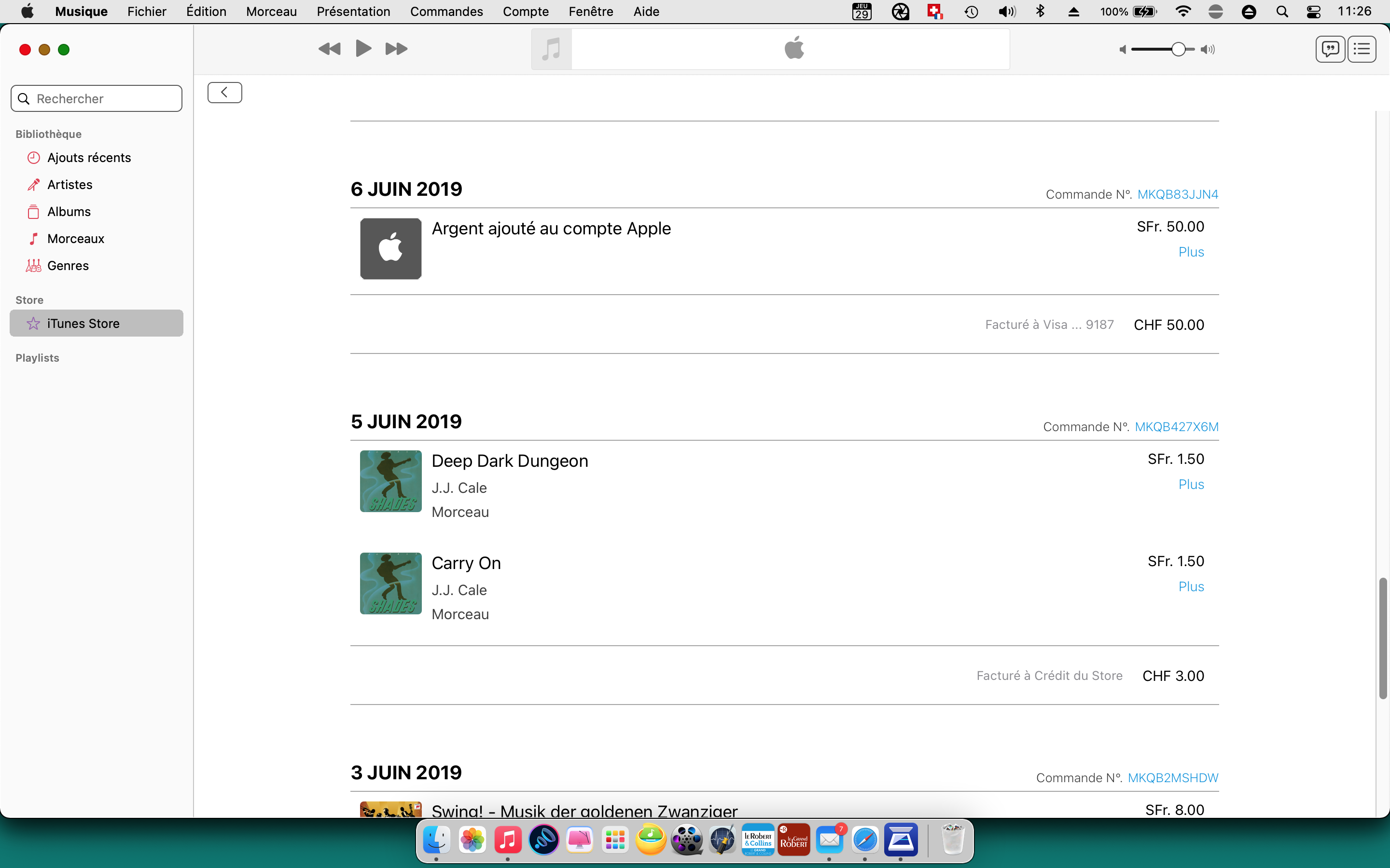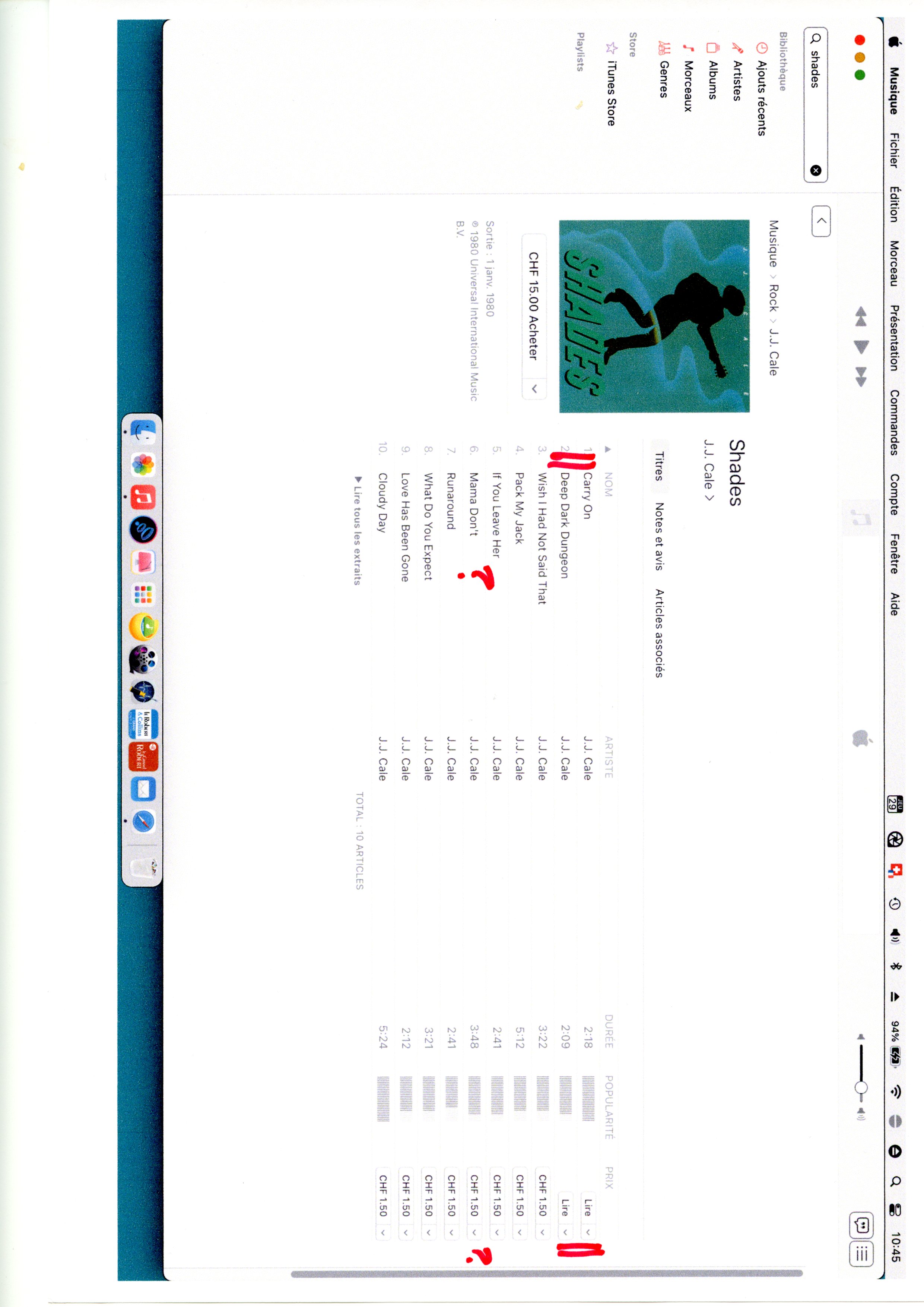 Je retrouve bien l'achat du morceau «Mama Don't» en date du 10.11.2010. Le prix affiché de chf 1.60 pourrait être un prix de conversion euro-chf(?). maintenant il apparait dans l'album Shades dans ma bibliothèque.