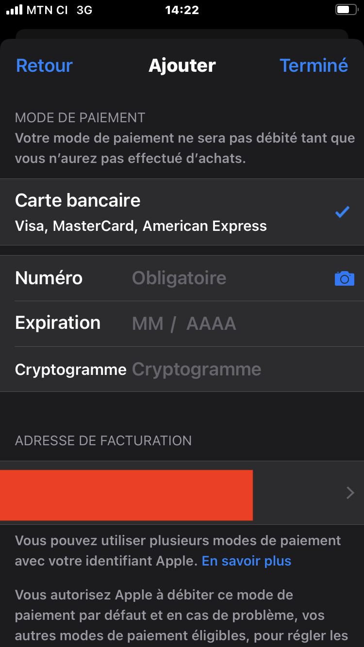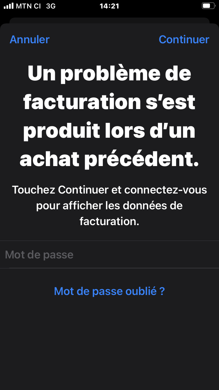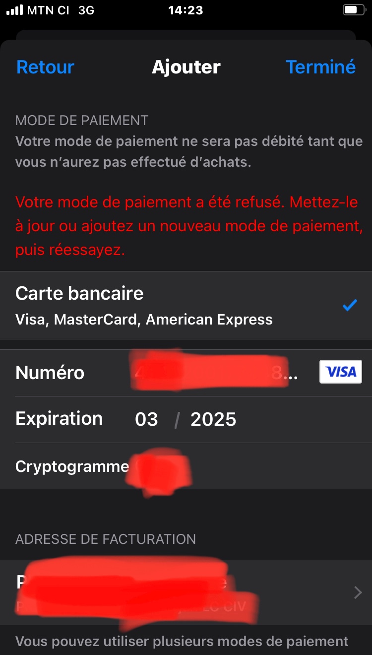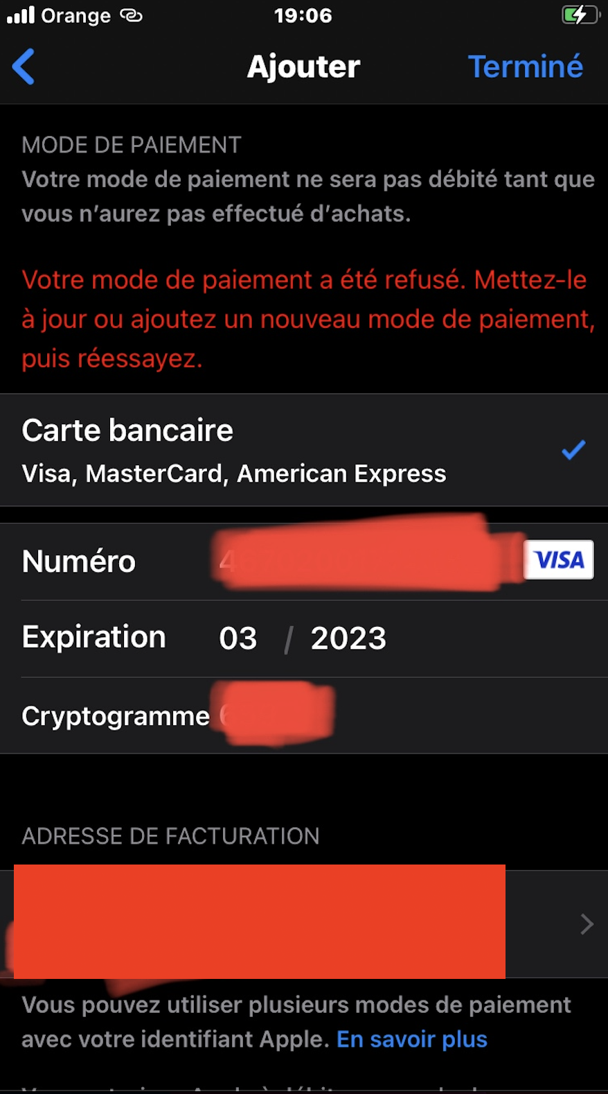 Je n’arrive plus à faire la mise à jour ni le téléchargement des applications sur App Store. je fais régulièrement des achats sur App Store avec ma carte visa. Pour effectuer une mise à jour ou un téléchargement de Facebook ou messenger, ou encore tinder etc on me demande de mettre le code de mon compte iCloud afin de vérifier les données de facturation(?!?) Je le fais ensuite je vois les informations de ma carte visa, j’ajoute le cryptogramme ensuite s’affiche le message suivant : mode de paiement refusé. J’ai du supprimer ce mode de paiement de mon compte mais cela continue toujours. On me demande expressément de faire la mise à jour de certaines applications avant 48h sinon j’y perdrai l’accès. Par exemple WhatsApp business j’utilise un numéro on off. J’ai pas renouvelé l’abonnement du numéro on off et si je ne fais pas la mise à jour de l’application WhatsApp business je n’aurai plus accès a mon compte et contacts business.
