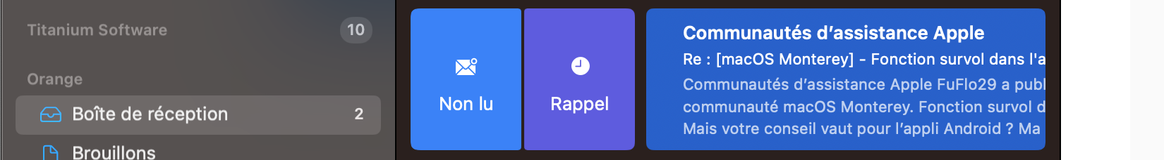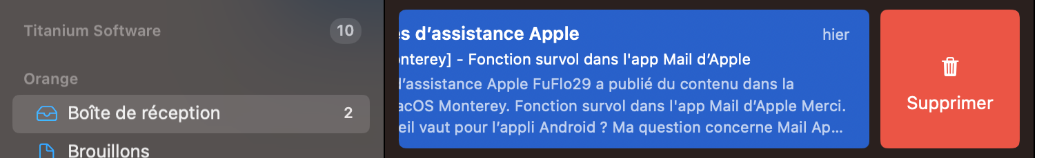 Bonjour, de nombreux services de messagerie comme Outlook ou Gmail propose des actions rapides par survols du mail (ex. Supprimer, Archiver, etc.). Cette fonction de « survol » est-elle disponible dans l’application Mail d’Apple ? Merci.